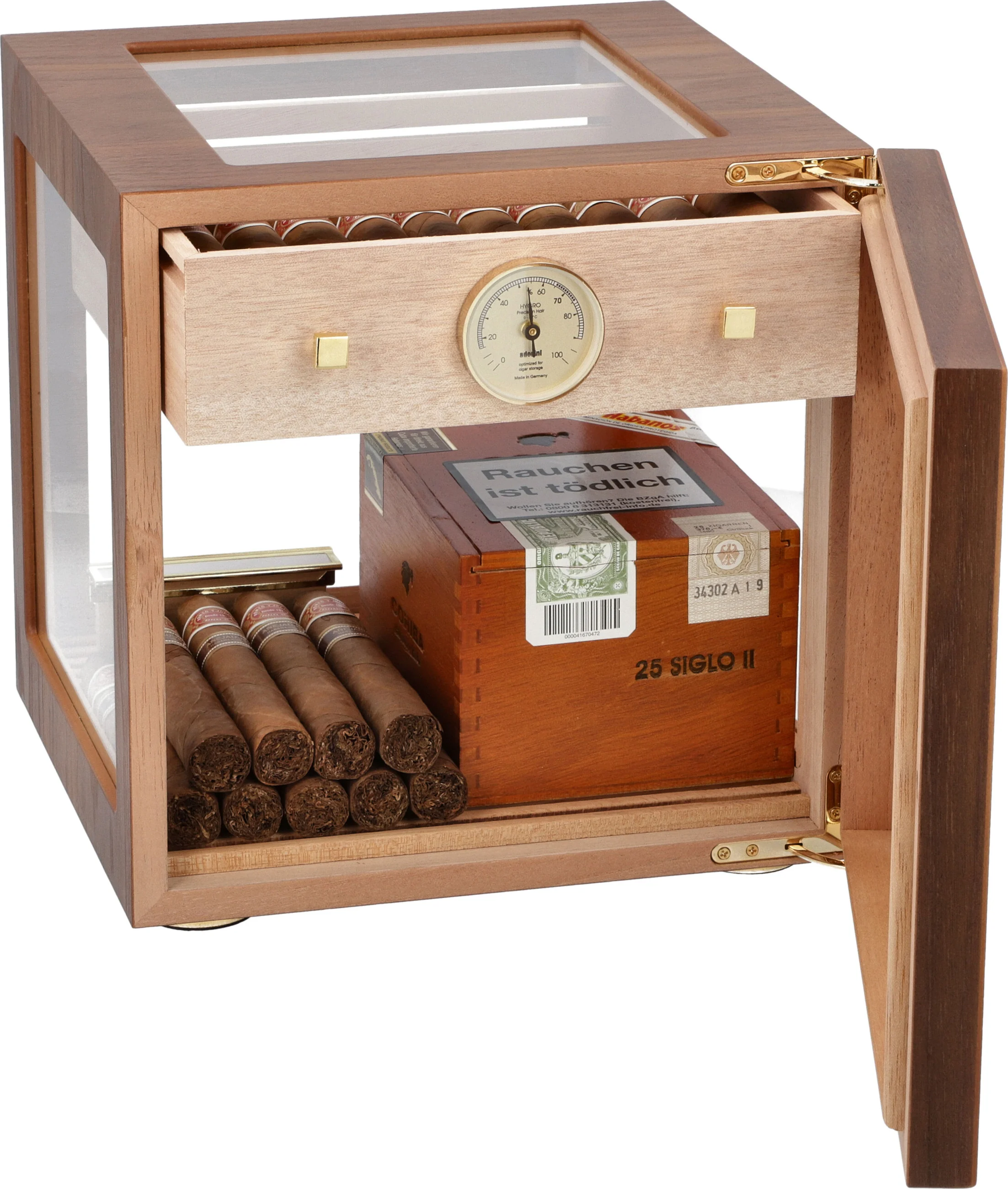 lämpimällä saksanpähkinäviilullaan ja ympärilasitetulla rakenteellaan, joka mahdollistaa arvokkaan sikarikokoelmasi näkymän. Kullatut saranat ja kaksi kultaista neliökahvaa vetolaatikossa antavat humidorille eksklusiivisen ulkonäön. Hienovarainen aukko oven karmissa mahdollistaa lasitetun oven avaamisen helposti.