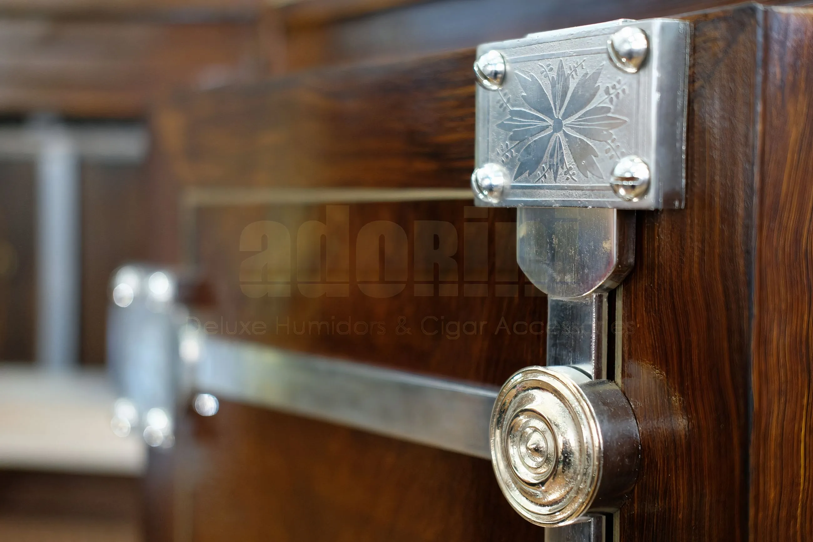 Kassakaapin jokainen osa on huolella kunnostettu ja räätälöity uuteen käyttötarkoitukseensa. Pienet metalliosat galvanoitiin, sisätilat vuorattiin setripuulla, ja yhteensopivat laatikot ja tarjottimet valmistettiin käsityönä. Humidori on jaettu kahteen osaan. Ylempää puoliskoa, joka on valmistettu täysteräksestä, käytetään sikarien säilytykseen. Uusi, käsin maalattu pinta on tehty erittäin huolellisesti ja yksityiskohtaisesti, ja se antaa raskaalle raudalle raikkaan jalopuun ilmeen. Massiivisen oven avaaminen tuo kuitenkin aina mieleen kassakaapin alkuperäisen käyttötarkoituksen. Alempi puoli on kokonaan puuta, ja sille tehtiin sama huolellinen käsittely kuin yläpuolella olevalle osalle käsin maalaten, jotta nämä kaksi osaa sulautuisivat saumattomasti toisiinsa. Myös muita ylellisyystuotteita, kuten viiniä tai väkeviä alkoholijuomia, voidaan säilyttää täällä täydellisesti.