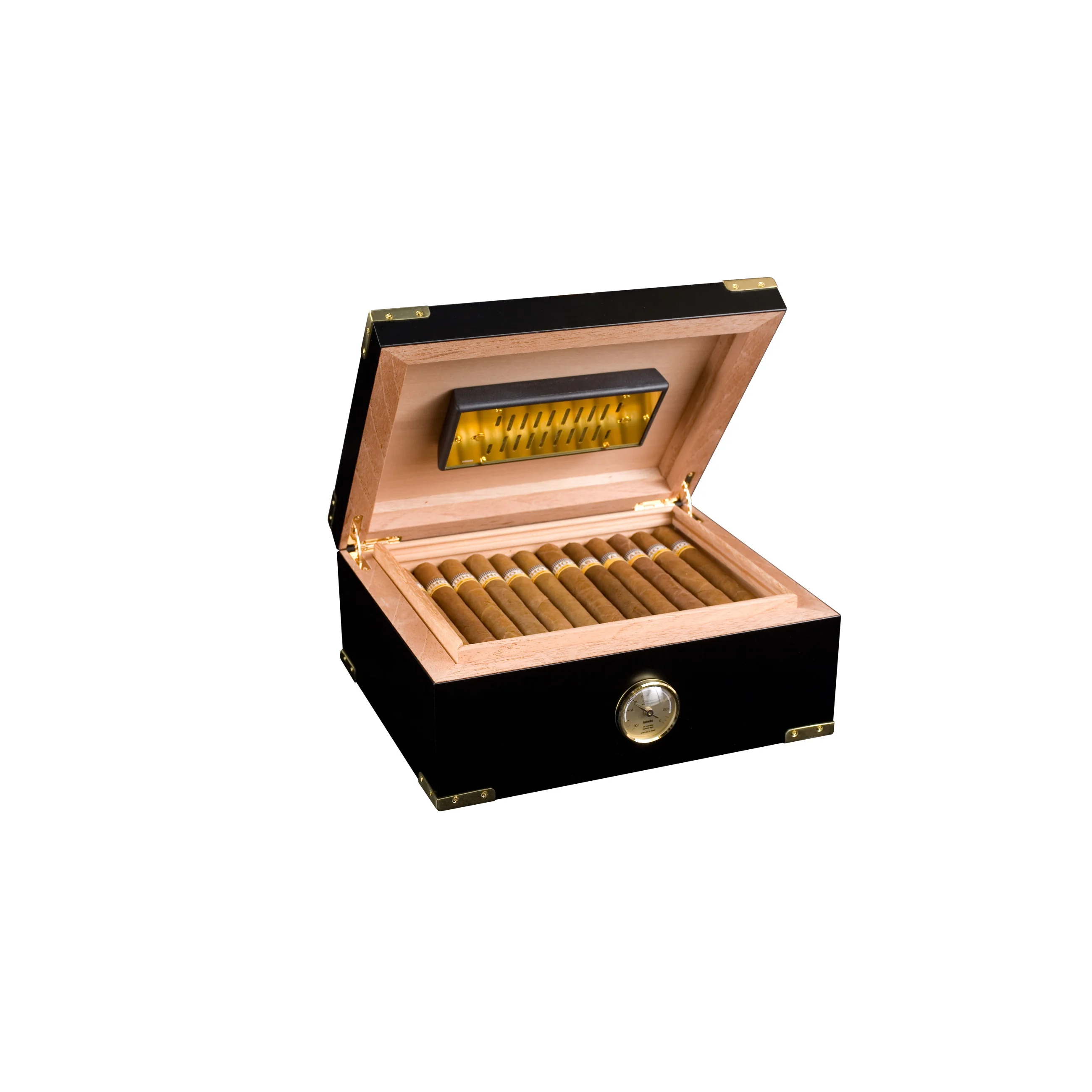 Muistuttaen vanhoja höyrylaiva-arkkuja, tämä kostutin saa sinut haaveilemaan valtamerelle suuntautuvista pakomatkoista klassisella mustaksi lakatulla viimeistelyllä ja kullatuilla messinkisillä kulmasuojilla. Etuosan tarkka analoginen hygrometrituo ulkoasuun lisää erottuvuutta samalla kun erittäin paksu runko takaa tukevan ja kestävän rakenteen. Raskas 24K kullatut nelikulmaiset saranattarjoavat tasaisen liikkeen, kun kansi avataan ja paljastuuespanjalainen setrisisusjossa on Adorinin ainutlaatuiset RibTech-tuuletusluut, jotka parantavat ilmankiertoa.