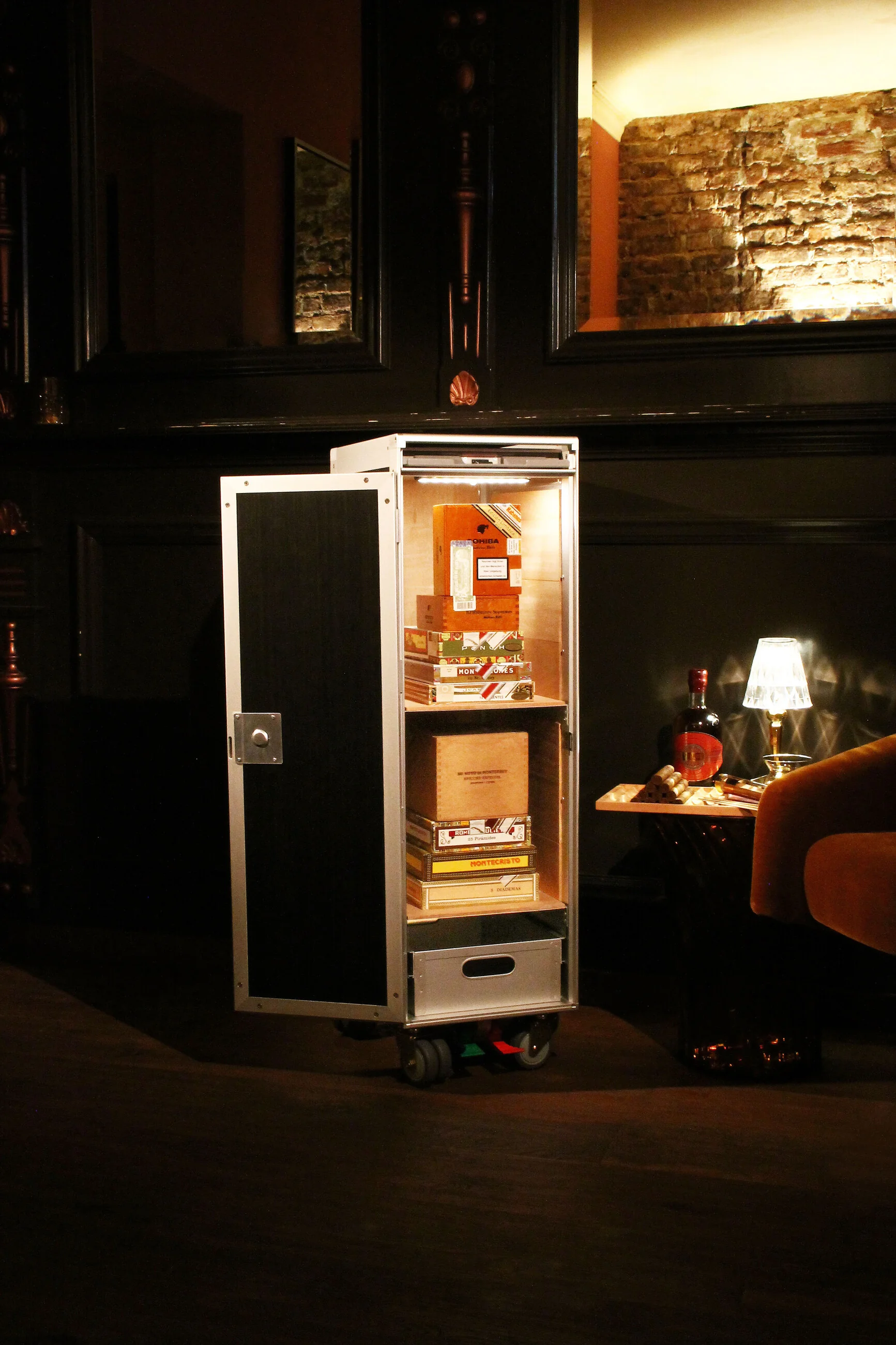 Adorini Cigar Trolley Black on adorinin toinen pyörillä oleva sikarihumidori, todella eksklusiivinen kappale, joka on valmistettu Saksassa muuttamalla entinen ilmailuvaunu käsintehdyksi mestariteokseksi. Tämä tuote ei ole pelkkä humidori vaan tyylin ilmentymä, joka sopii täydellisesti mihin tahansa ympäristöön, olipa kyseessä sitten moderni teollinen ilme tai luonnollisen esteettinen ympäristö. Se sopii myös erinomaisesti käytettäväksi hotelleissa, ravintoloissa ja sikariloungeissa tarjoten vieraillesi unohtumattoman kokemuksen. Tämän vaunun avulla sikareita ei vain tarjoilla - teet vieraisiisi pysyvän vaikutuksen. Vaunu on vuorattu hienoimmalla okumepuulla optimaalisten sikarisäilytysolosuhteiden varmistamiseksi, ja siinä on kaksi säilytystasoa sikarilaatikoille. Alhaalla moderni alumiinilaatikko tarjoaa tilaa tavaroiden, kuten esimerkiksi viski- tai rommipullon, suosikkilukemistosi tai muiden tarvikkeiden, säilyttämiseen mahdollistaen sinulle vaunun mukauttamisen mieleiseksesi.