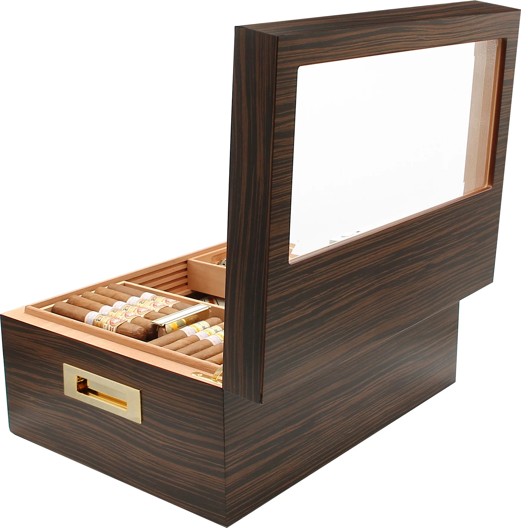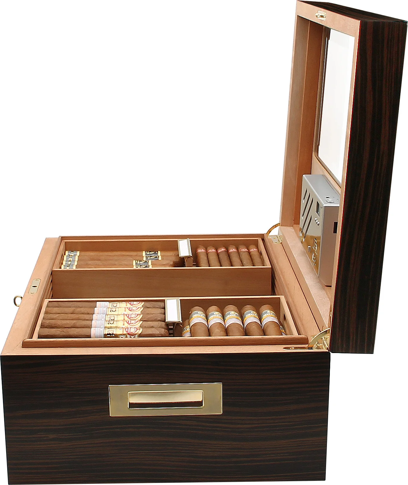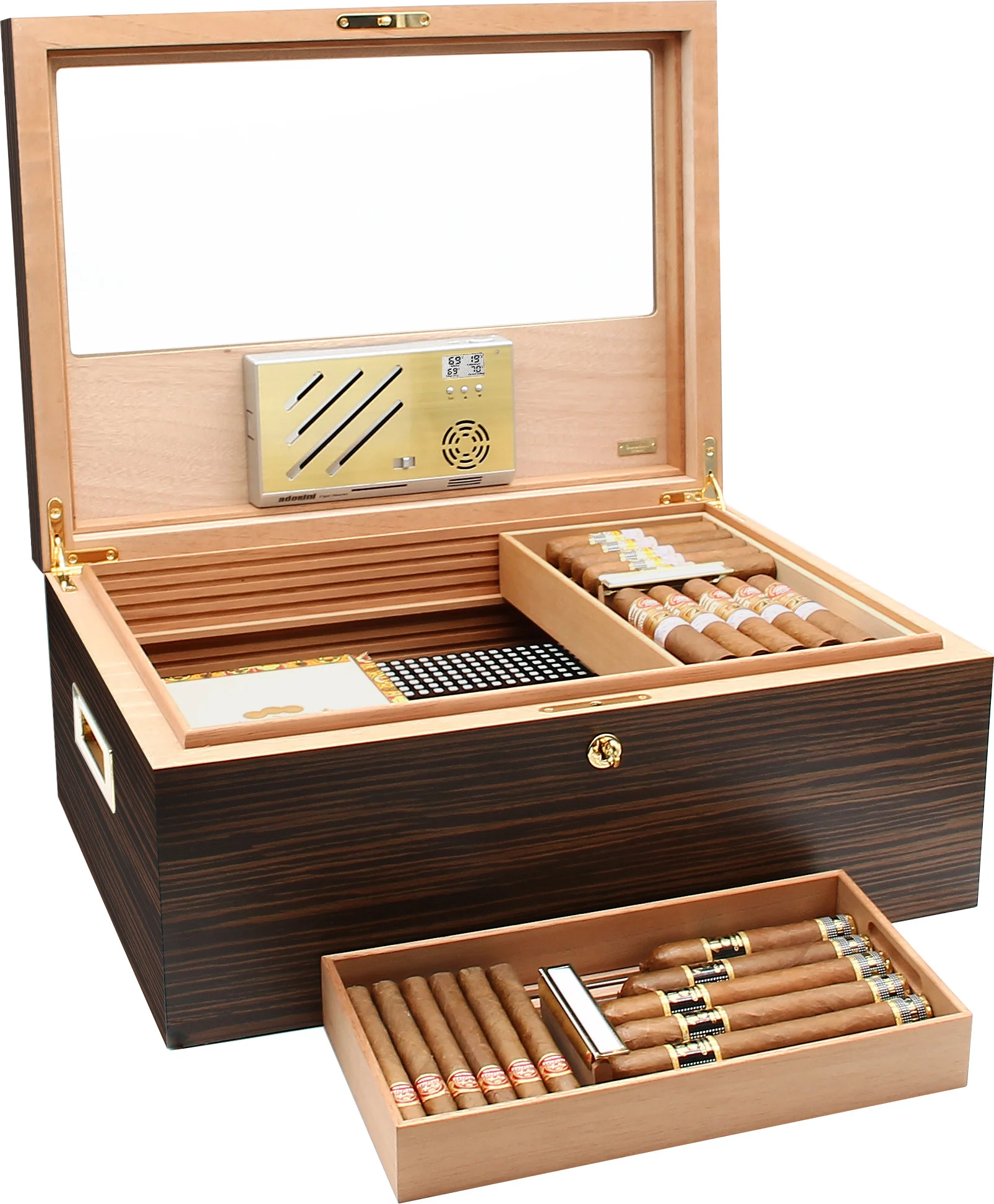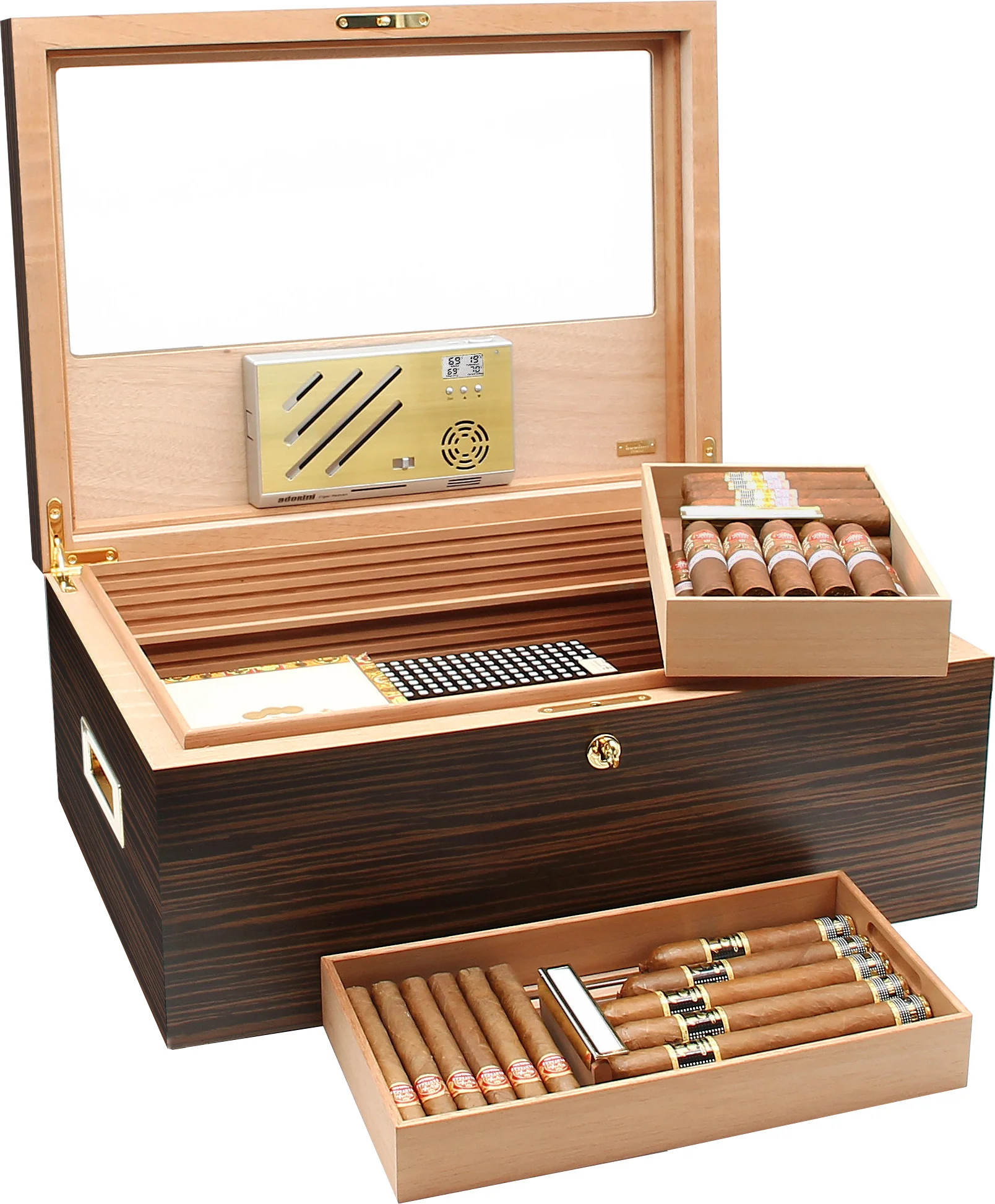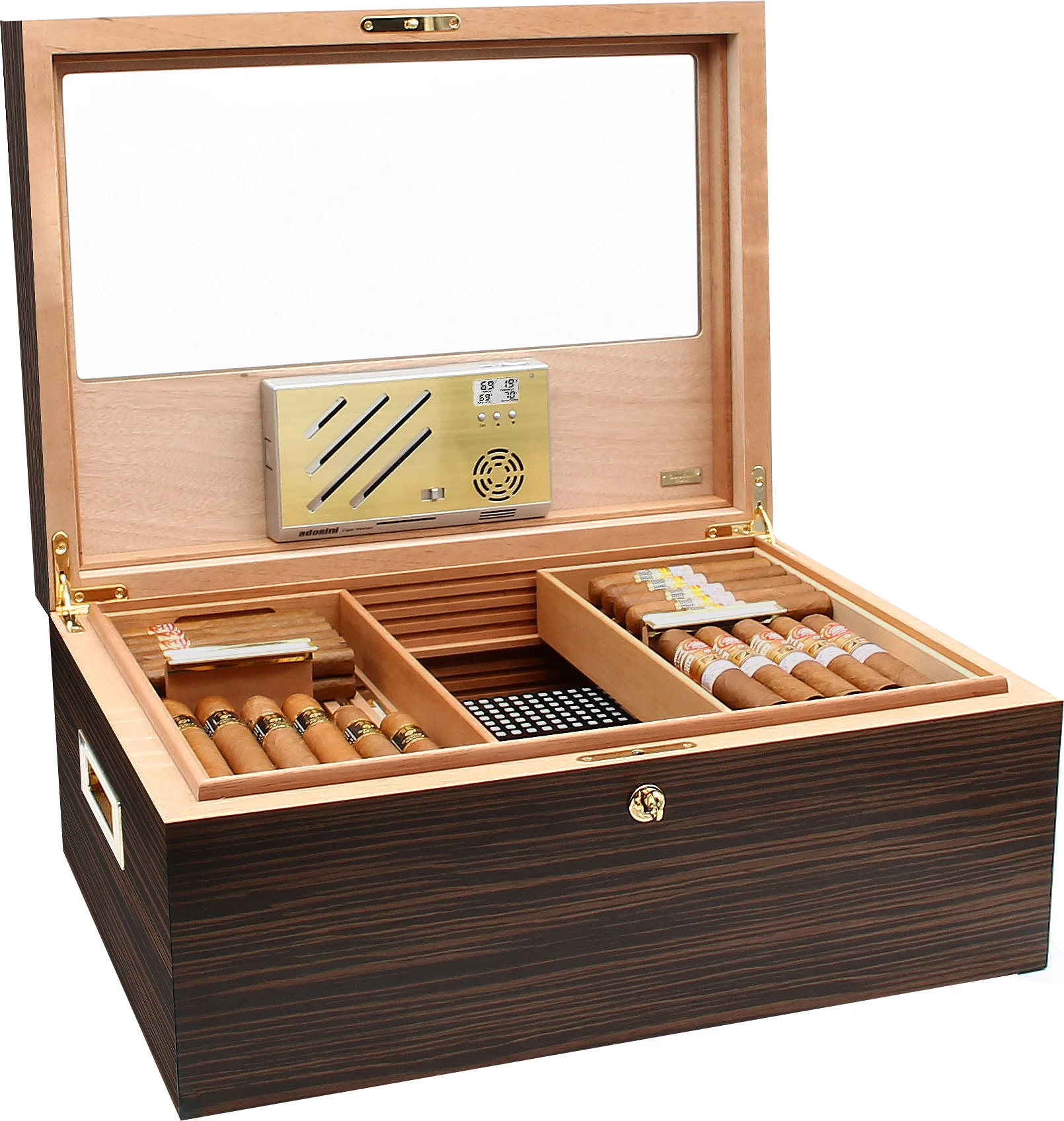 - Tehokas elektroninen ilmankostutin sisältyy ja asennettu kanteen. - Ainutlaatuinen muotoilu. Yksi suurimmista tavallisista työpöydän humidoreista. - Cigar Aficionado Magazine suosittelee.