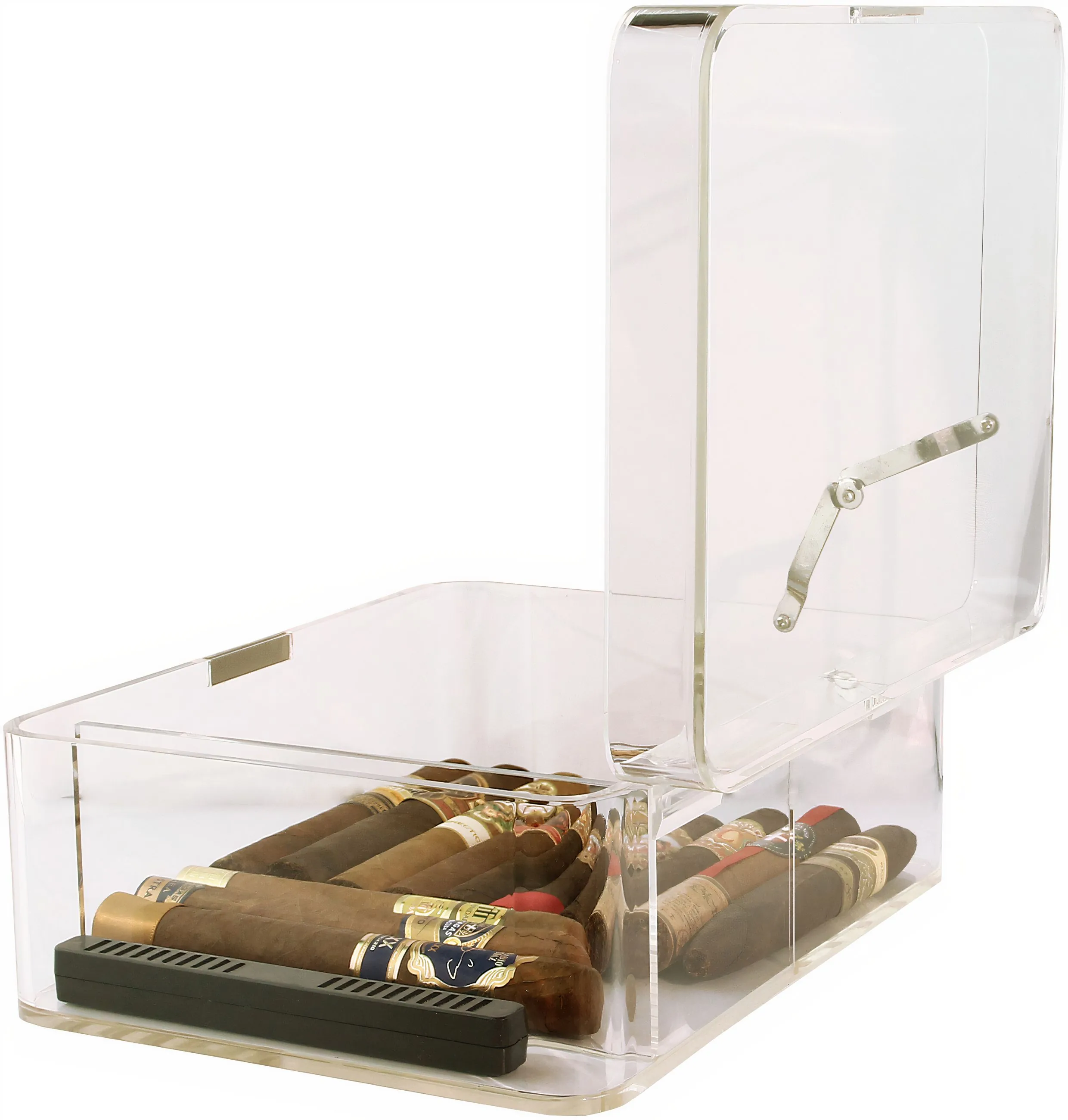 Akryylihumidoreista on tulossa yhä suositumpia, ja ne edustavat nykyaikaista varastointivaihtoehtoa sikarin ystäville. Olivat ne sitten kirkkaita tai sävytettyjä – ne eivät tarjoa ainoastaan turvallista suojaa, vaan ne myös esittelevät kokoelmaasi tyylillä. Tämä akryylihumidori yhdistää toiminnallisuutta houkuttelevaan muotoiluun ja tarjoaa tilaa noin 50 sikarille.