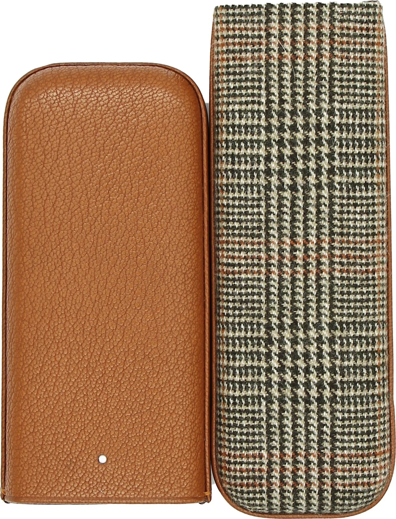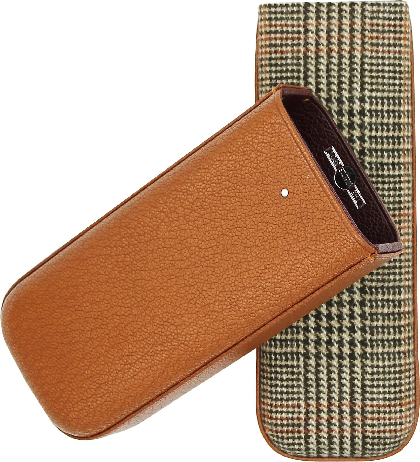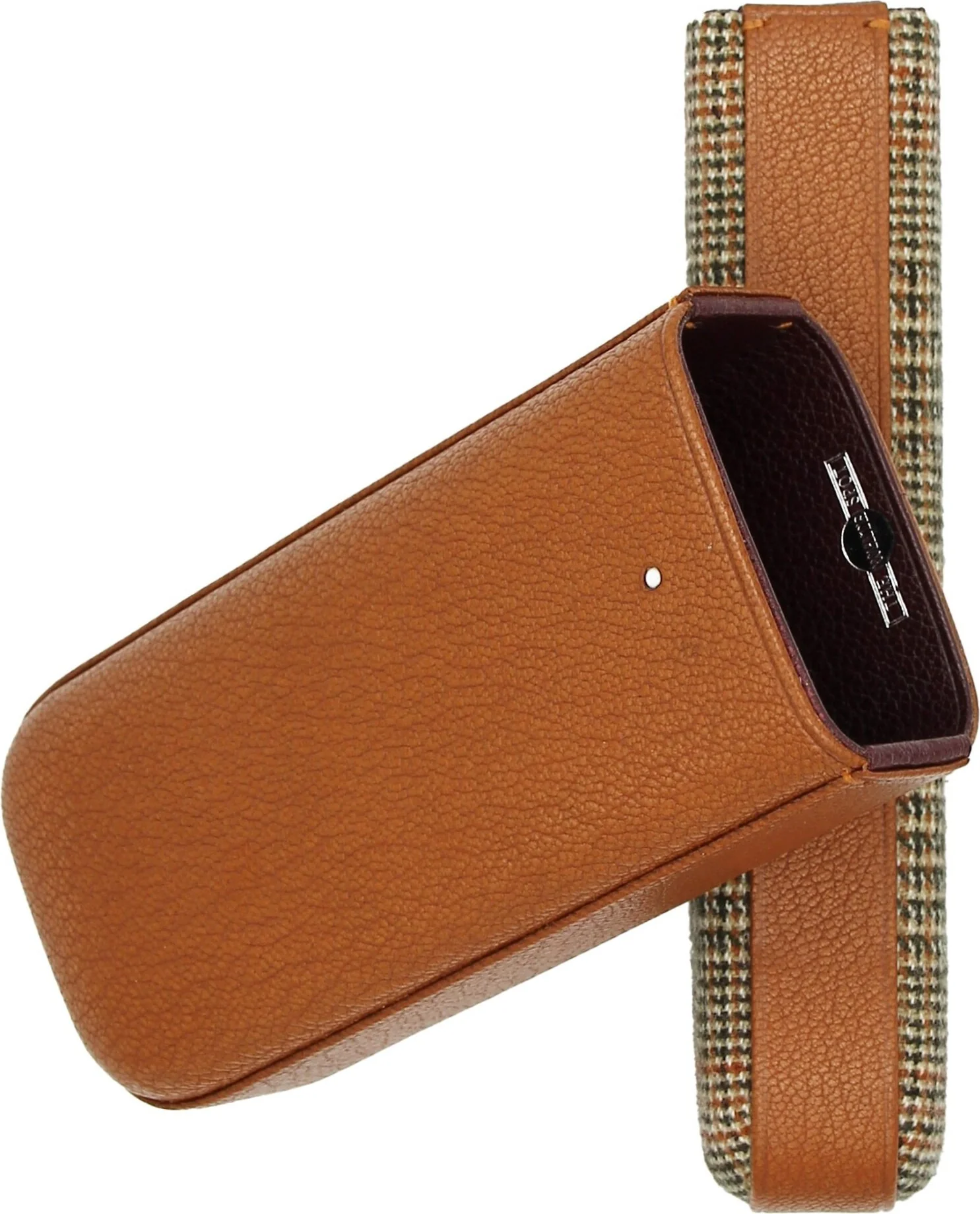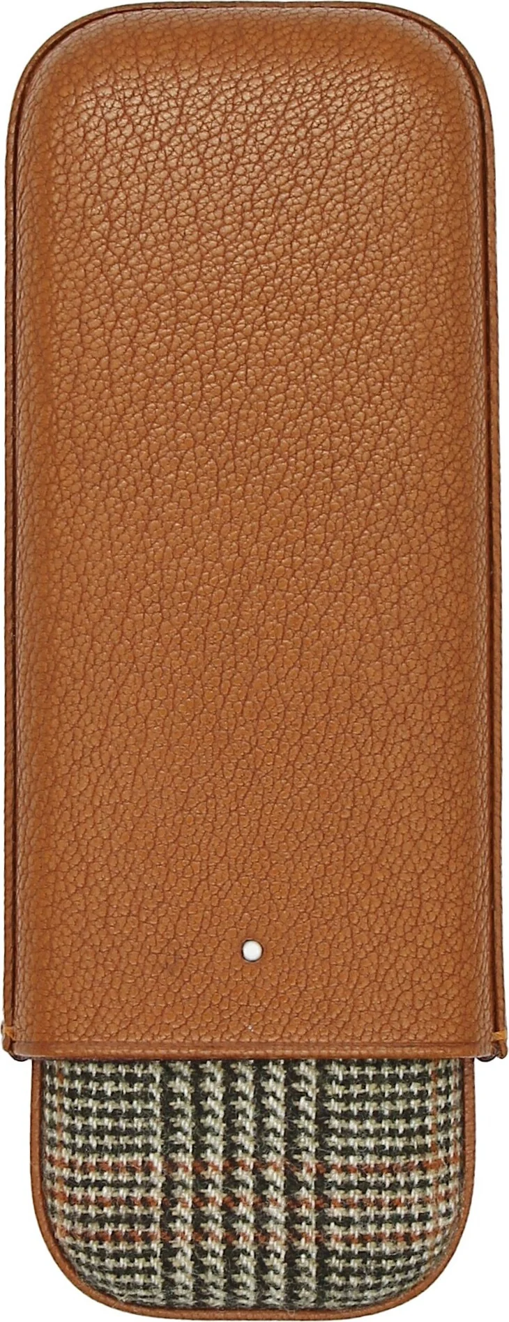 Tässä liukukotelossa yhdistyvät hienoin ruskea nahka ja tweed-kangaspohja. Poikkeuksellisen tyylikäs yhdistelmä, jota harvoin näkee sikarimaailmassa. Etupuolella on Dunhillin erottamaton White Spot -logo.