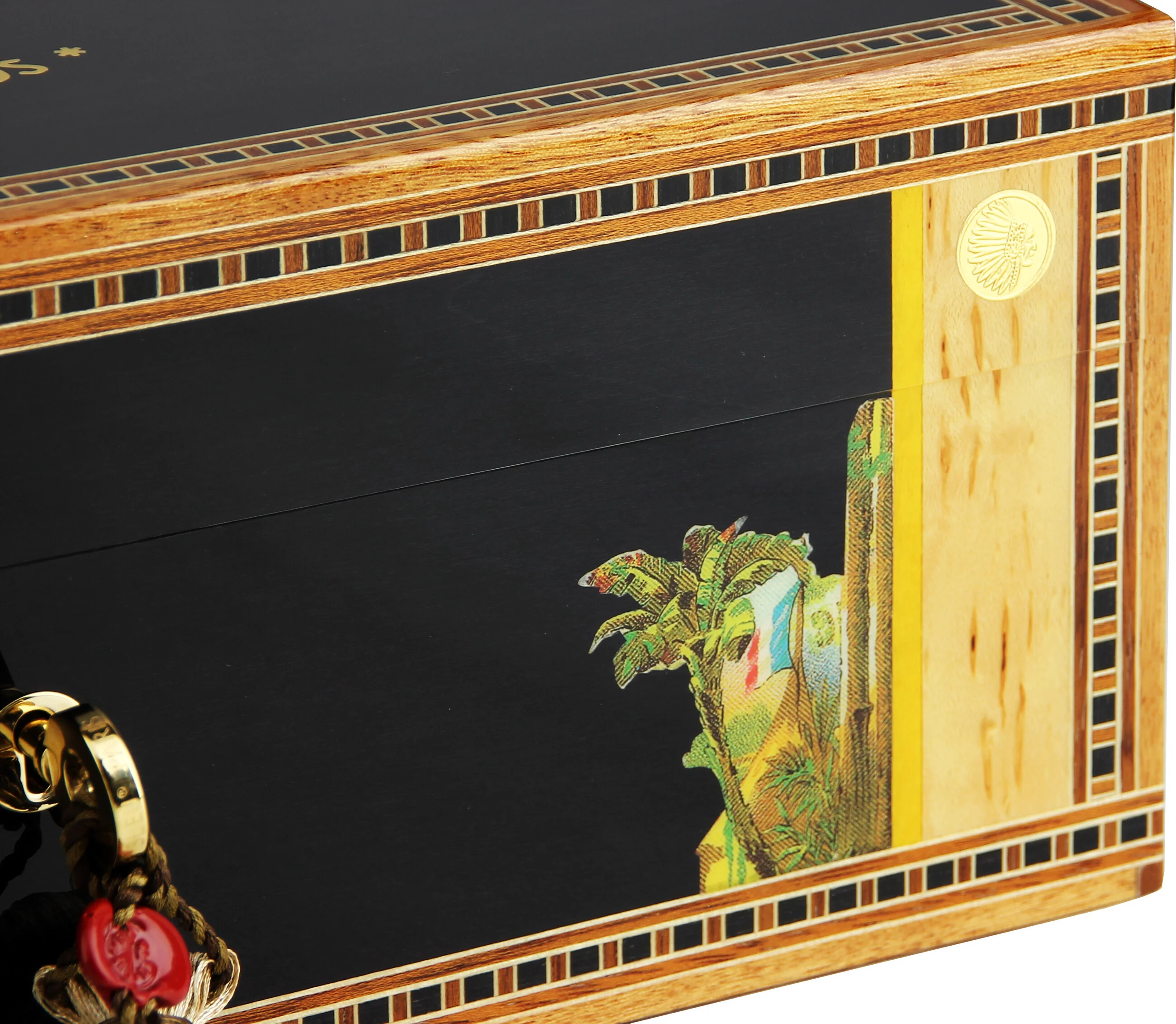 Ensiluokkainen rakenne: humidorin tukevaa rakennetta täydentävät kestävät kultaiset saranat ja avain, johon on kaiverrettu tuotemerkin logo.