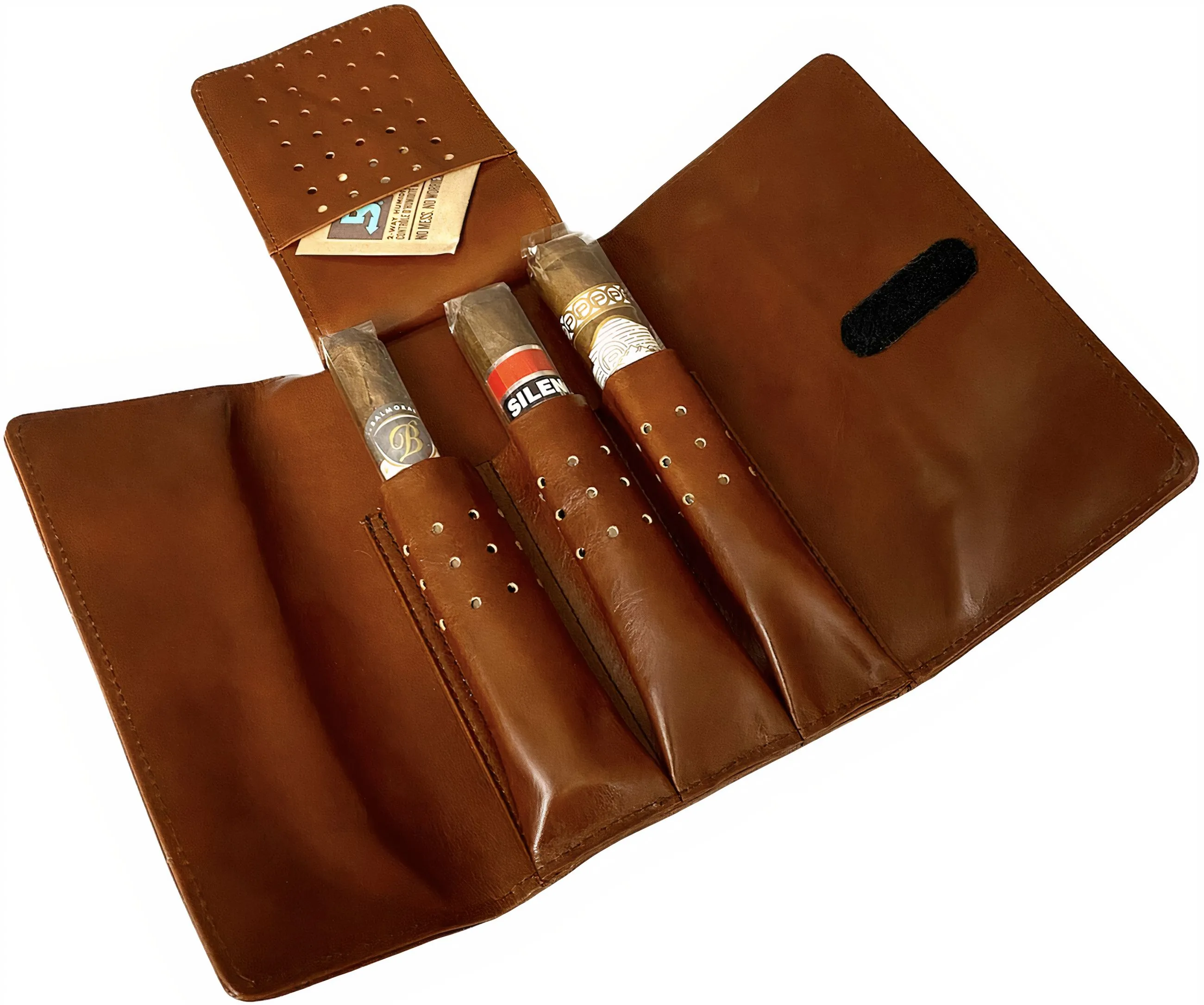 Korkealaatuinen ja käytännöllinen sikarikotelo, joka on valmistettu hienoimmasta nahasta, ja joka on tarkoitettu liikkeellä oloon