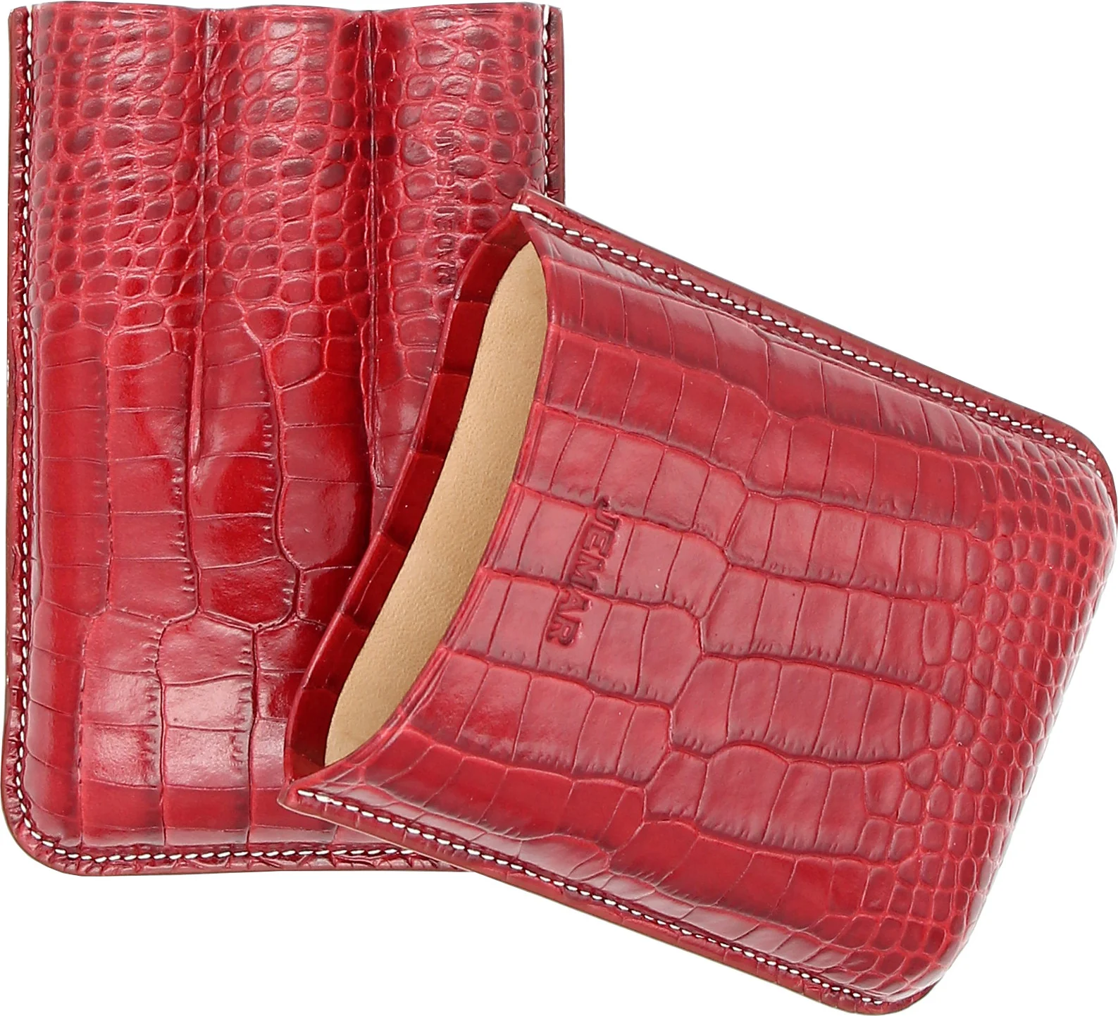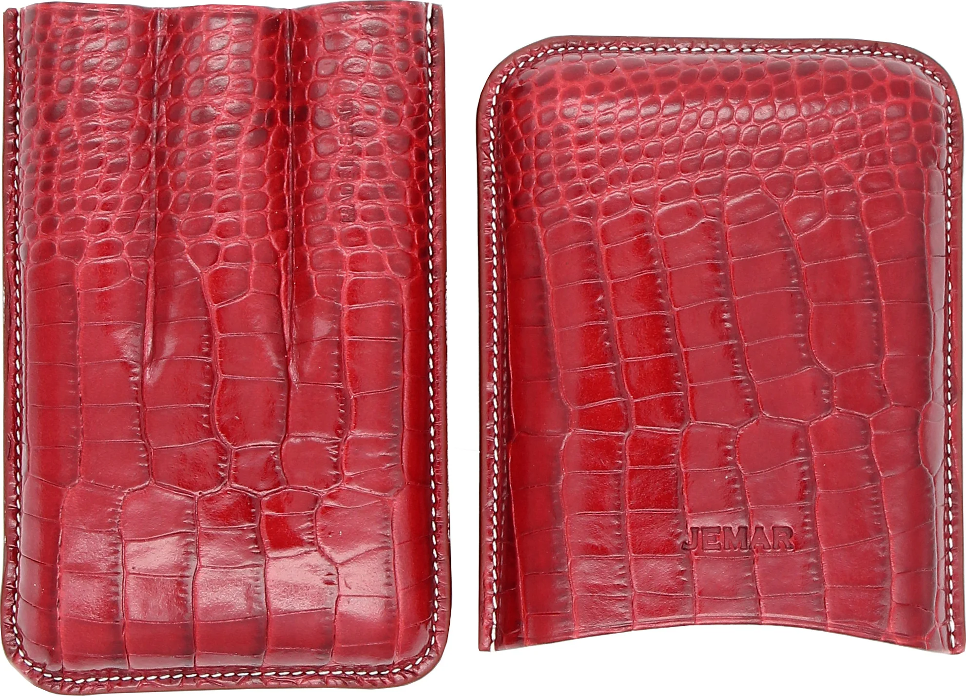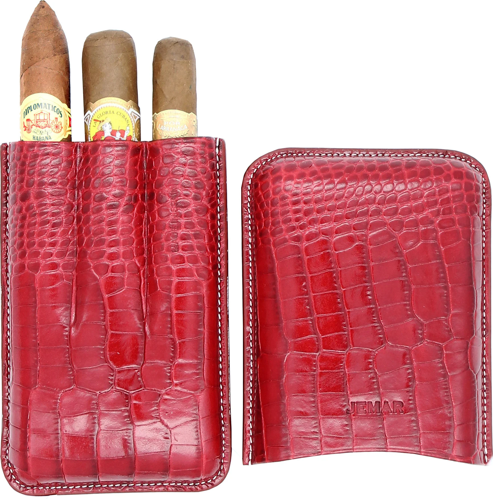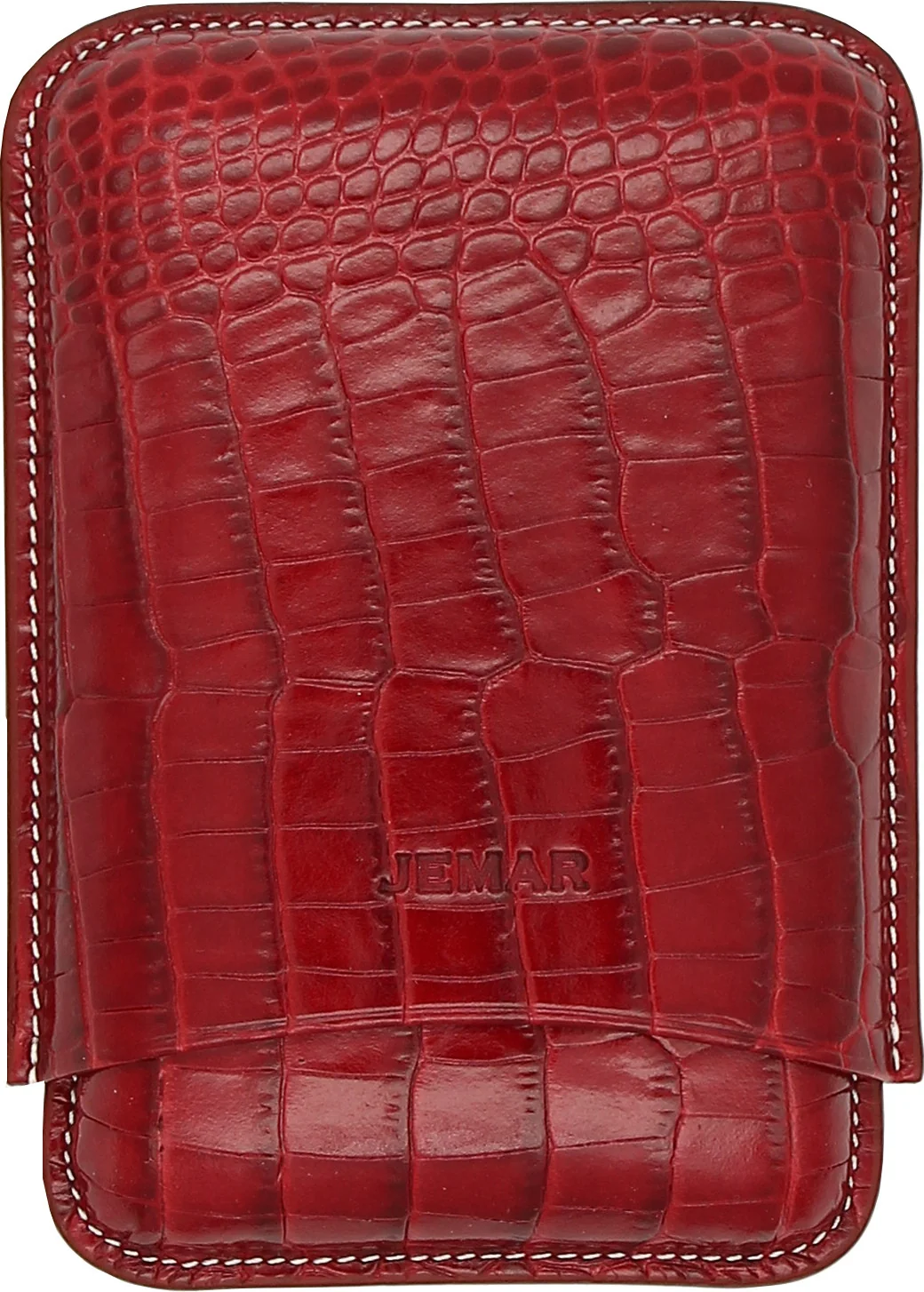 Jemar Nahkainen sikarikotelo kolmelle sikarille on tyylikäs lisävaruste laatua ja ammattitaitoa arvostaville harrastajille. Aitoa punaista krokotiiliefektinahkaa, jossa on kevyet koristeompeleet, valmistettu kotelo tekee vaikutuksen tyylikkyydellään ja toiminnallisuudellaan. Kotelon sisäpuoli on vuorattu kevyellä sileällä nahalla, mikä luo hienostuneen ulkonäön lisäksi myös lisäsuojaa sikareille.