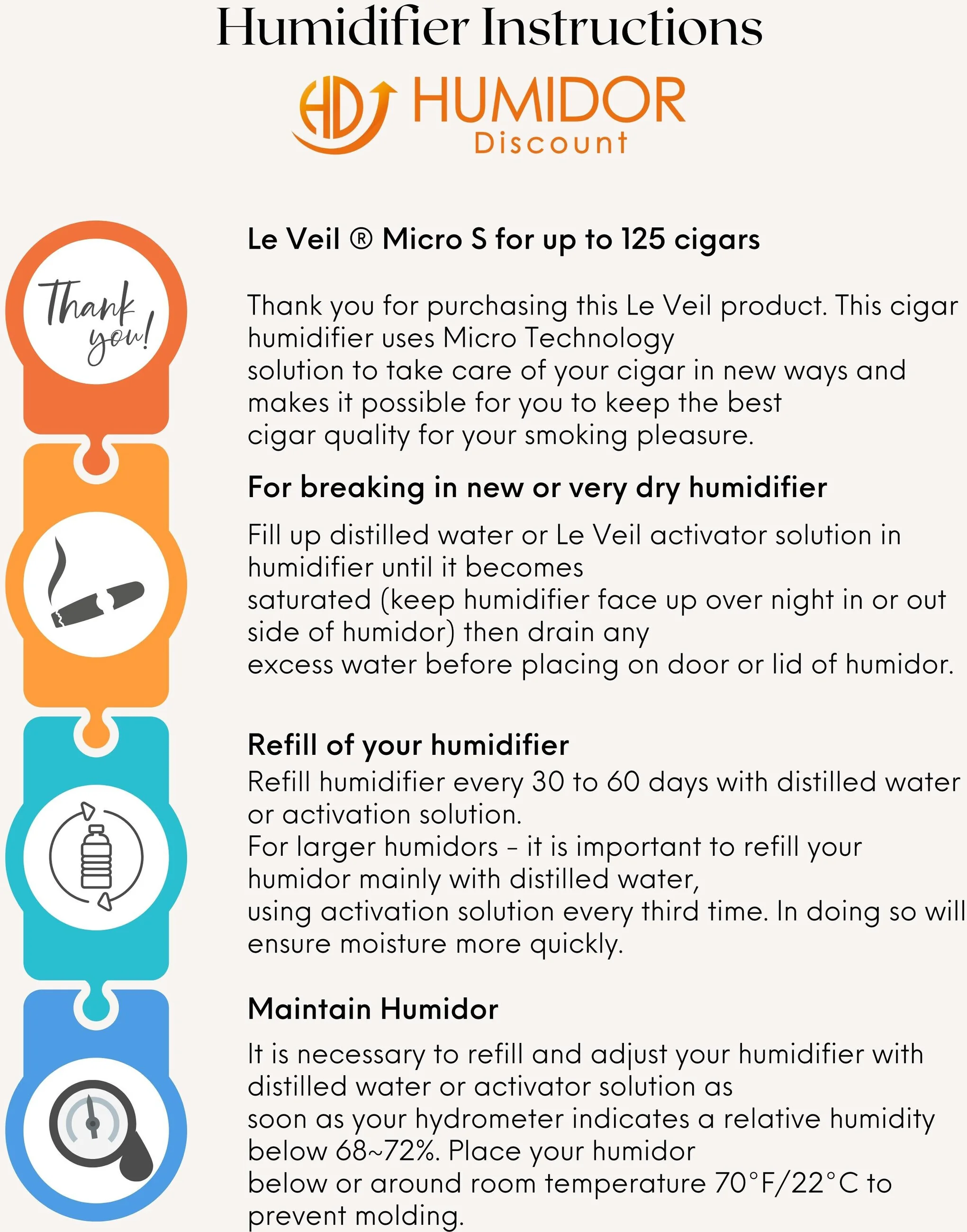 Le Veil Micro S -sikarikostutin on korkealaatuinen järjestelmä, joka kostuttaa tehokkaasti jopa 125 sikaria noin 70 %:n kosteudella. Siinä on säädettävä alumiininen läppä, siihen mahtuu kaksi kertaa enemmän vettä ja sen käyttöikä on neljä kertaa pidempi kuin tavallisten ilmankostuttimien. Se on erittäin helppokäyttöinen ja käytännössä huoltovapaa. Täytä se vain tislatulla vedellä tai kostutusliuoksella, ja se on valmis käytettäväksi humidorissa. Se kiinnittyy kaksipuolisella magneetilla ja teippijärjestelmällä, joka tarjoaa äärimmäistä mukavuutta. Innovatiivinen sieni, jota käytetään myös tunnetussa adorini Cigar Heavenissa, on peräisin lääketieteellisestä teknologiasta, toimii bakteerivastaisesti ja estää homeen humidorissa sienessä prosessoidun hopean avulla.