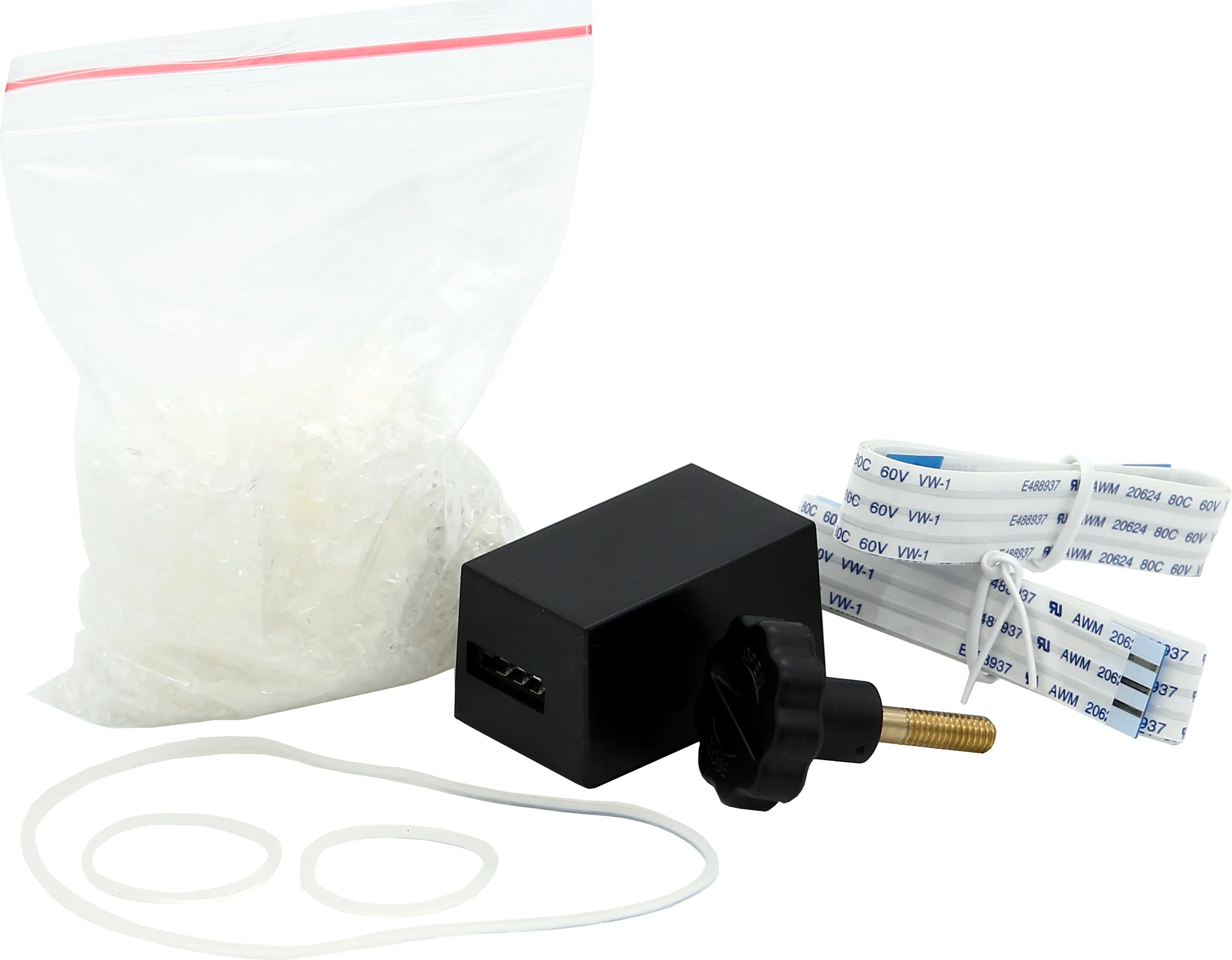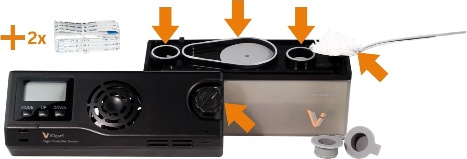 Pakkaus sisältää kidepakkauksen vesisäiliöön. Nämä varmistavat kosteuden tasaisen jakautumisen. Pakkauksen sisältö on suunniteltu useaan kertaan vaihdettavaksi. Hygieniasyistä ja ilmankostuttimen täyden suorituskyvyn säilyttämiseksi suositellaan kiteiden säännöllistä vaihtamista. Mukana on myös kolmiosainen tiivistysrenkaiden sarja, joka takaa tiiviin sinetin säiliön ja puhallinyksikön välillä. Näin järjestelmä toimii luotettavasti ja tehokkaasti. Lisäksi huoltosarja sisältää kaksinkertaisen sarjan litteitä kaapeleita, joissa on sopiva liitin virtalähteelle, joten se on ihanteellinen komponenttien vaihtamiseen tai uusimiseen tarpeen mukaan. Vararuuvi vesisäiliön turvalliseen kiinnittämiseen yläosaan täydentää sarjan.