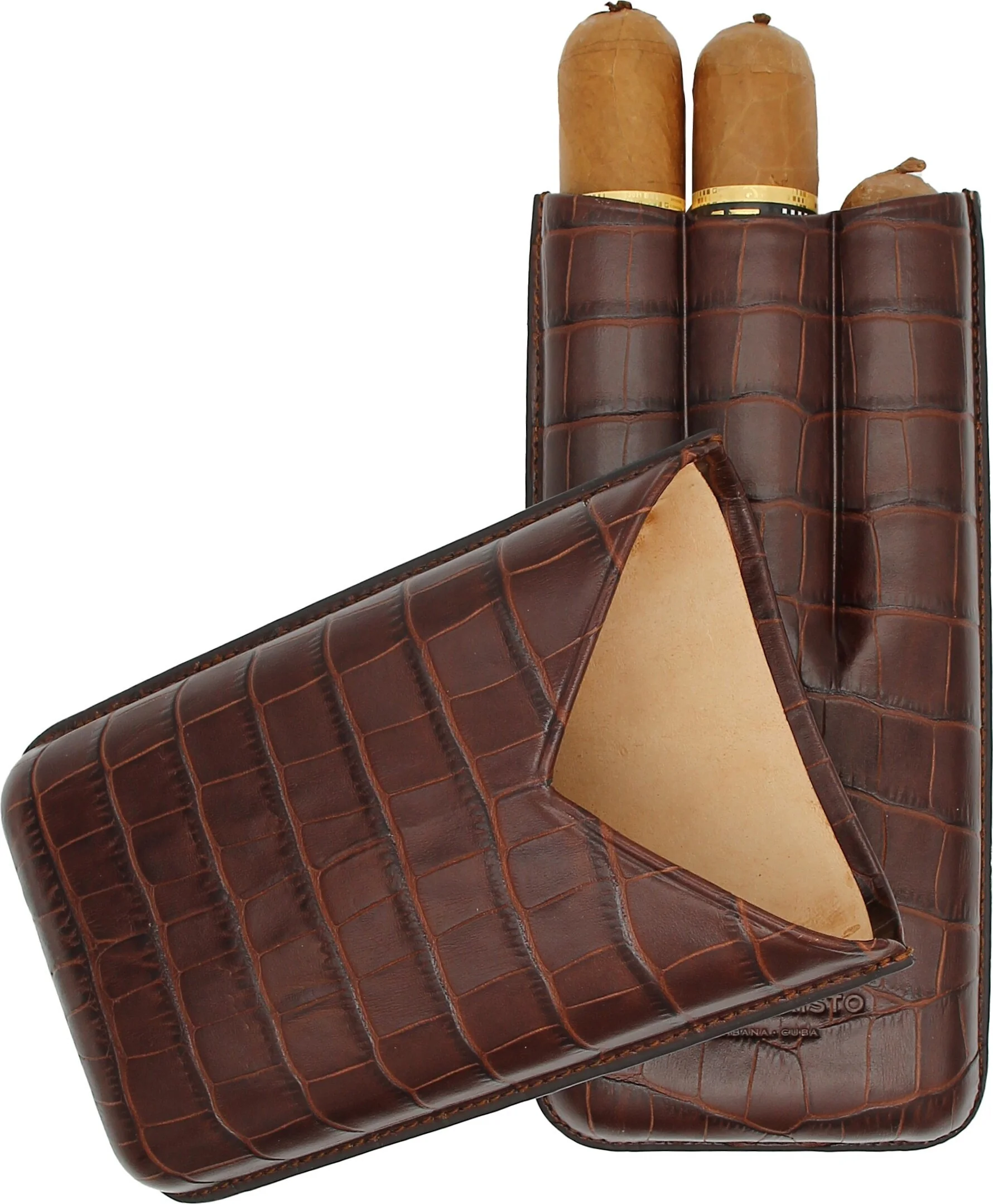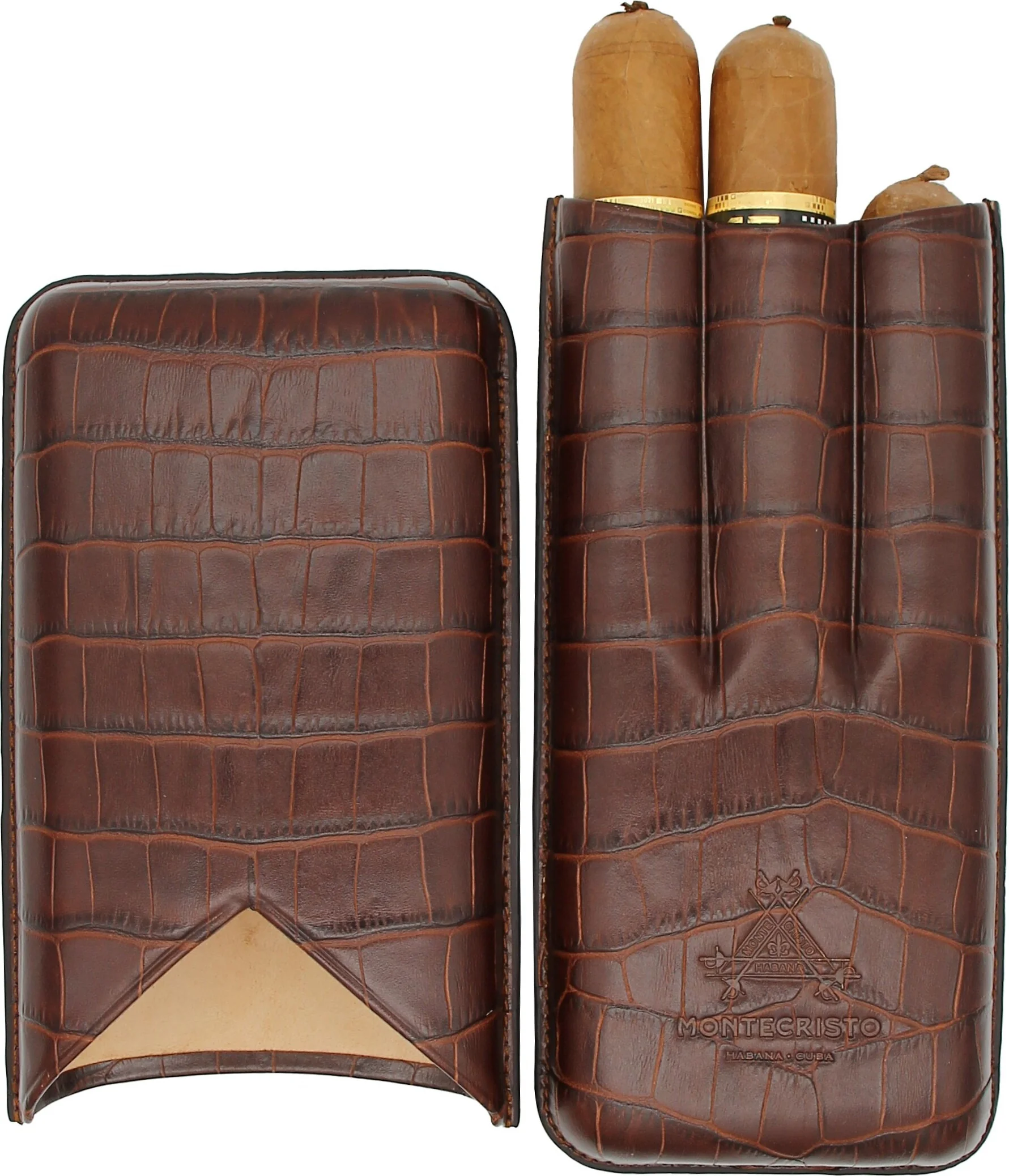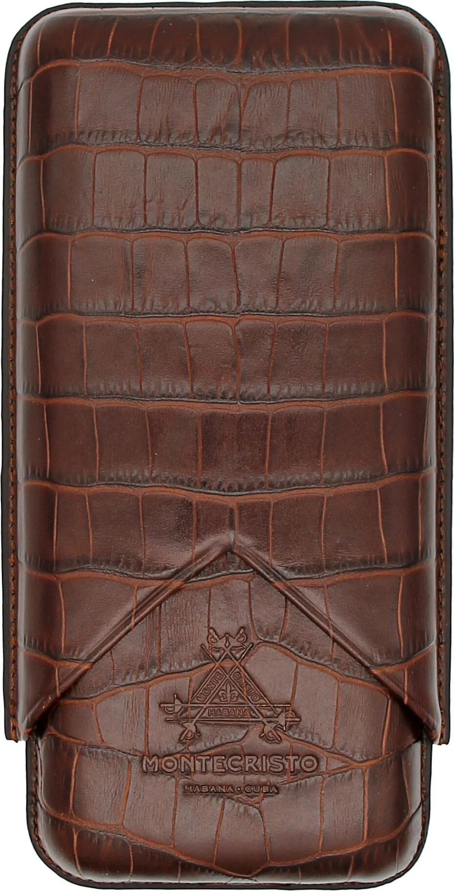 Montecriston sikarikotelo ajattoman tummanruskeassa värissä on kuubalaisen sikarimerkki Montecriston ylellinen asuste. Hienosti kuvioitu nahkapinta, jossa on krokotiilikuvio, antaa aidon ja laadukkaan tuntuman. Etupuolta koristaa kohokuvioitu tuotemerkin logo, joka edustaa yksiselitteisesti Montecristoa ja antaa kotelolle eksklusiivisen ilmeen.