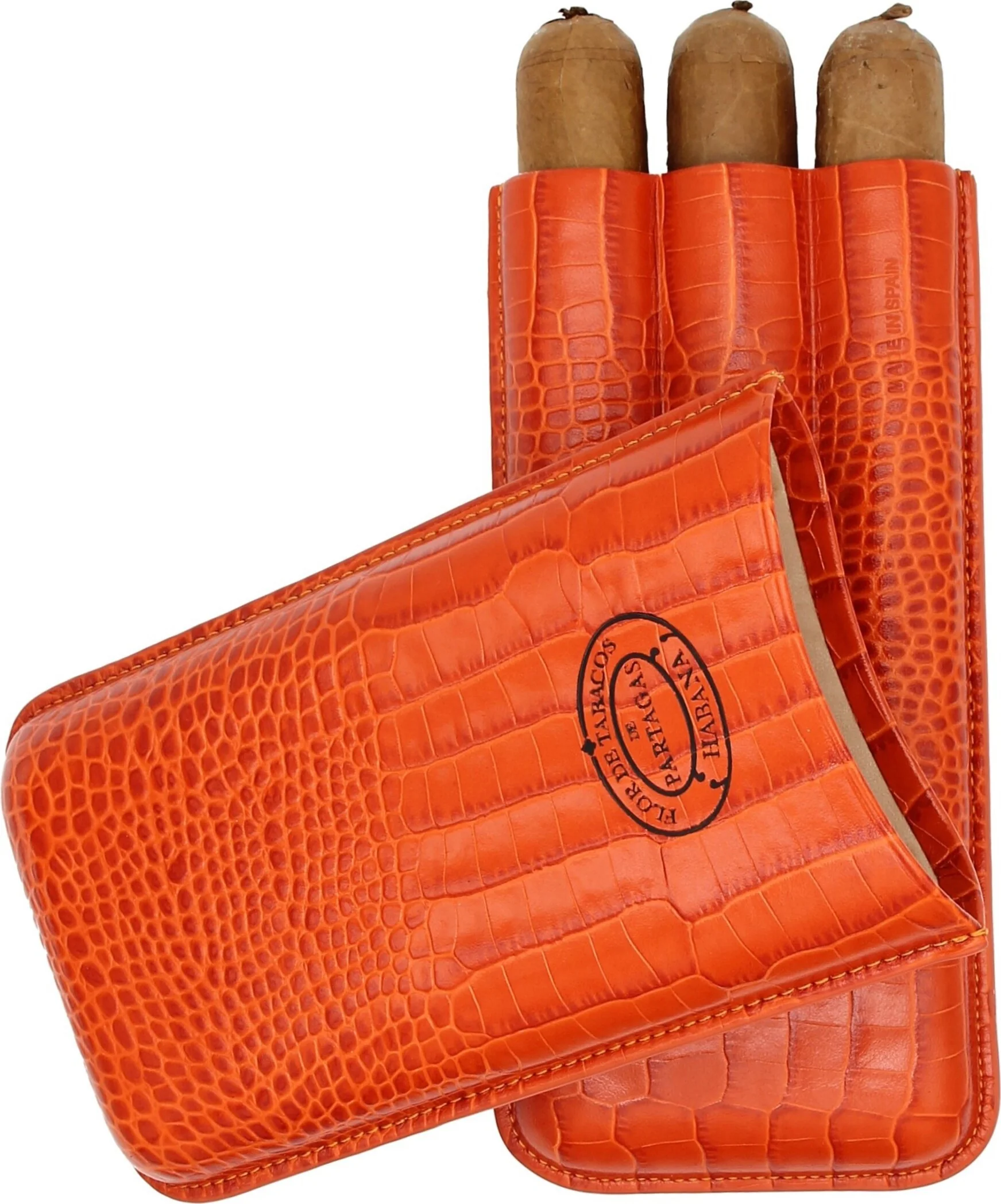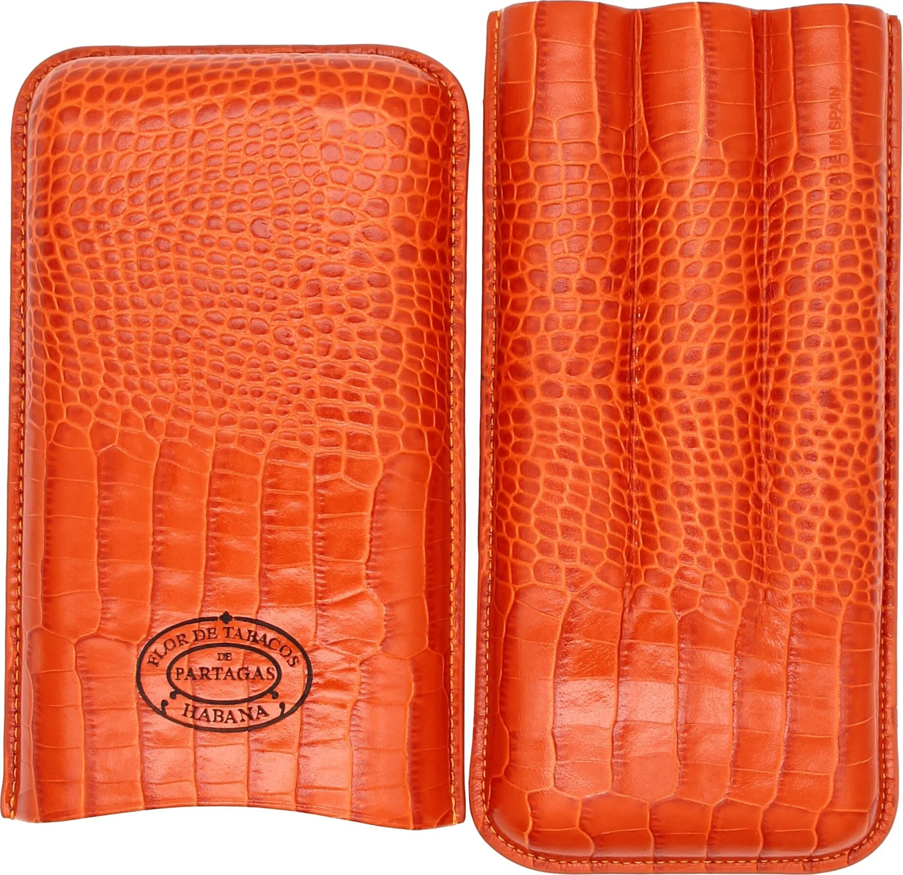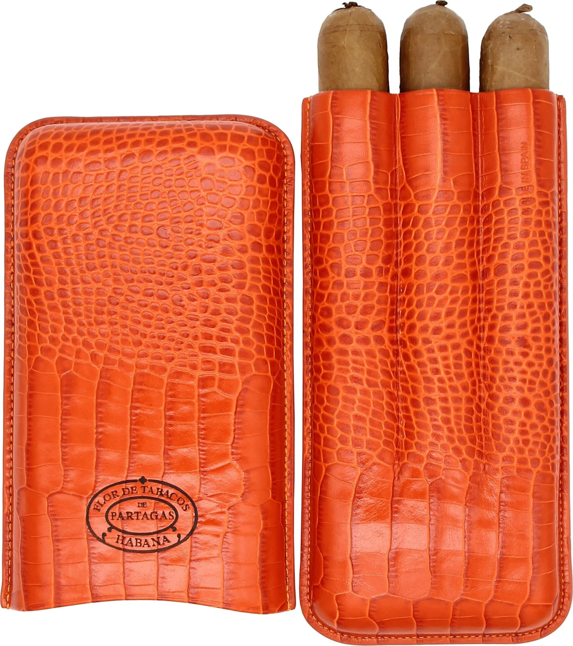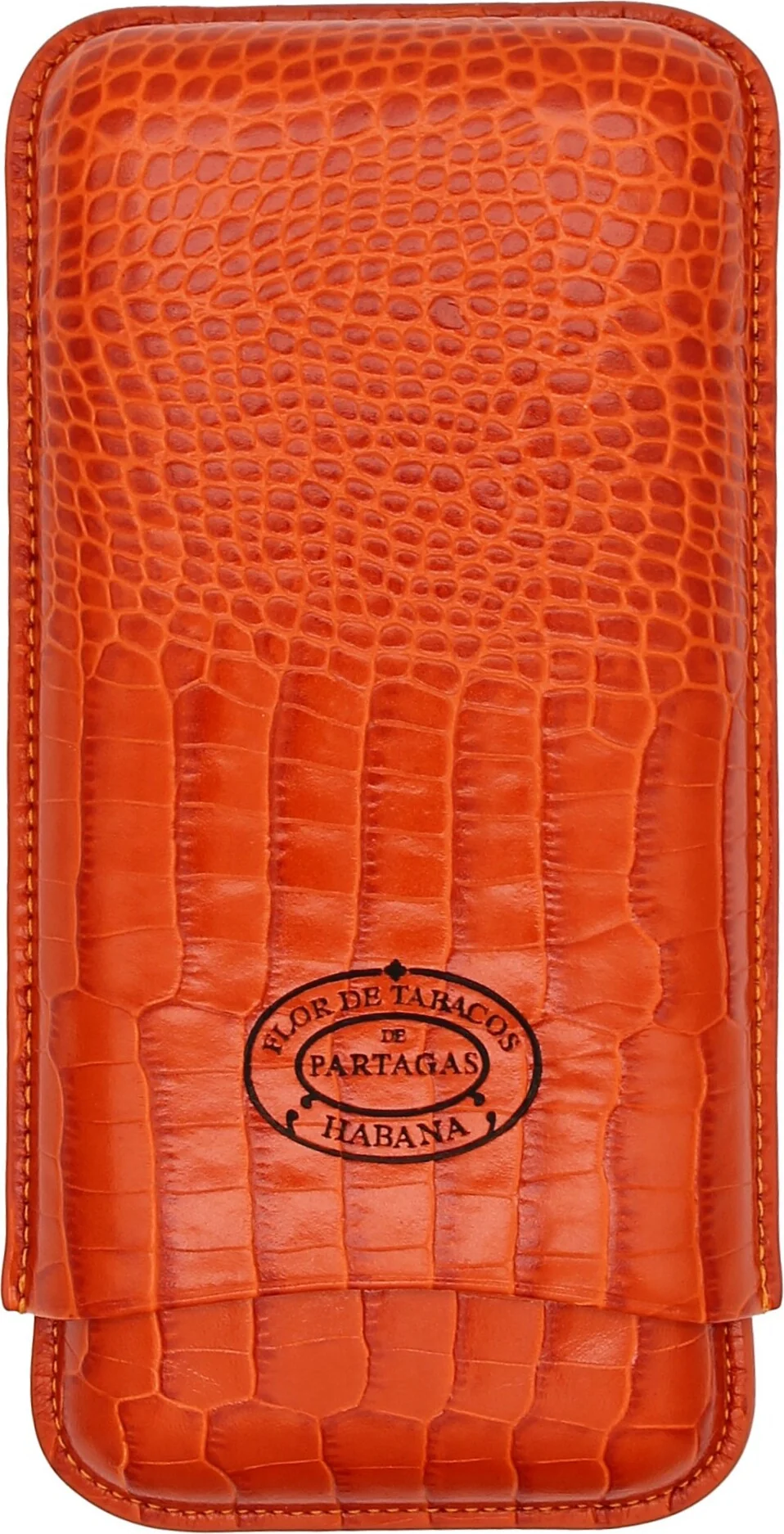 Partagas Classic -sikarikotelo, joka on valmistettu aidosta nahasta ja jonka väri on näyttävä oranssi, on kuubalaisen sikarimerkin Partagasin ylellinen lisävaruste. Hienosti kohokuvioitu nahkapinta, jossa on krokotiilimainen kuviointi, välittää autenttisen ilmeen. Partagas-tuotemerkkiä erehtymättömästi edustava tuotemerkin logo on näkyvästi esillä etupuolella, mikä antaa kotelolle eksklusiivisen ilmeen.