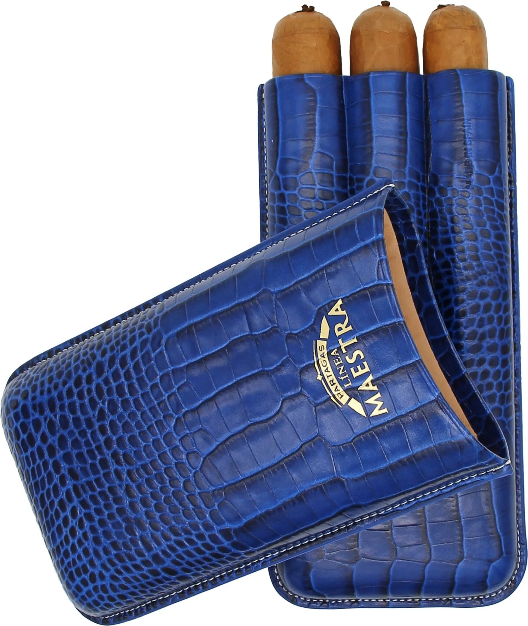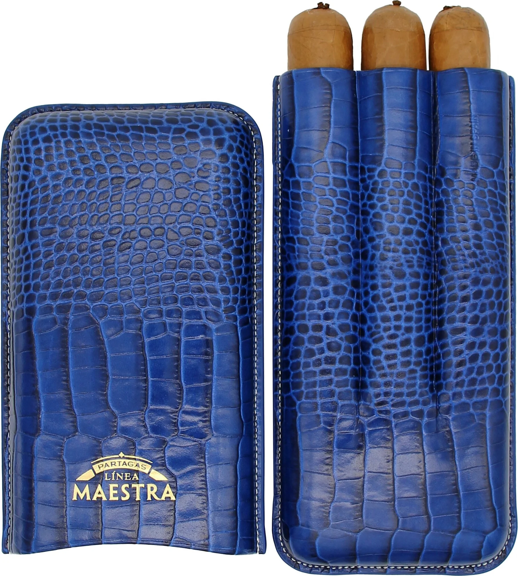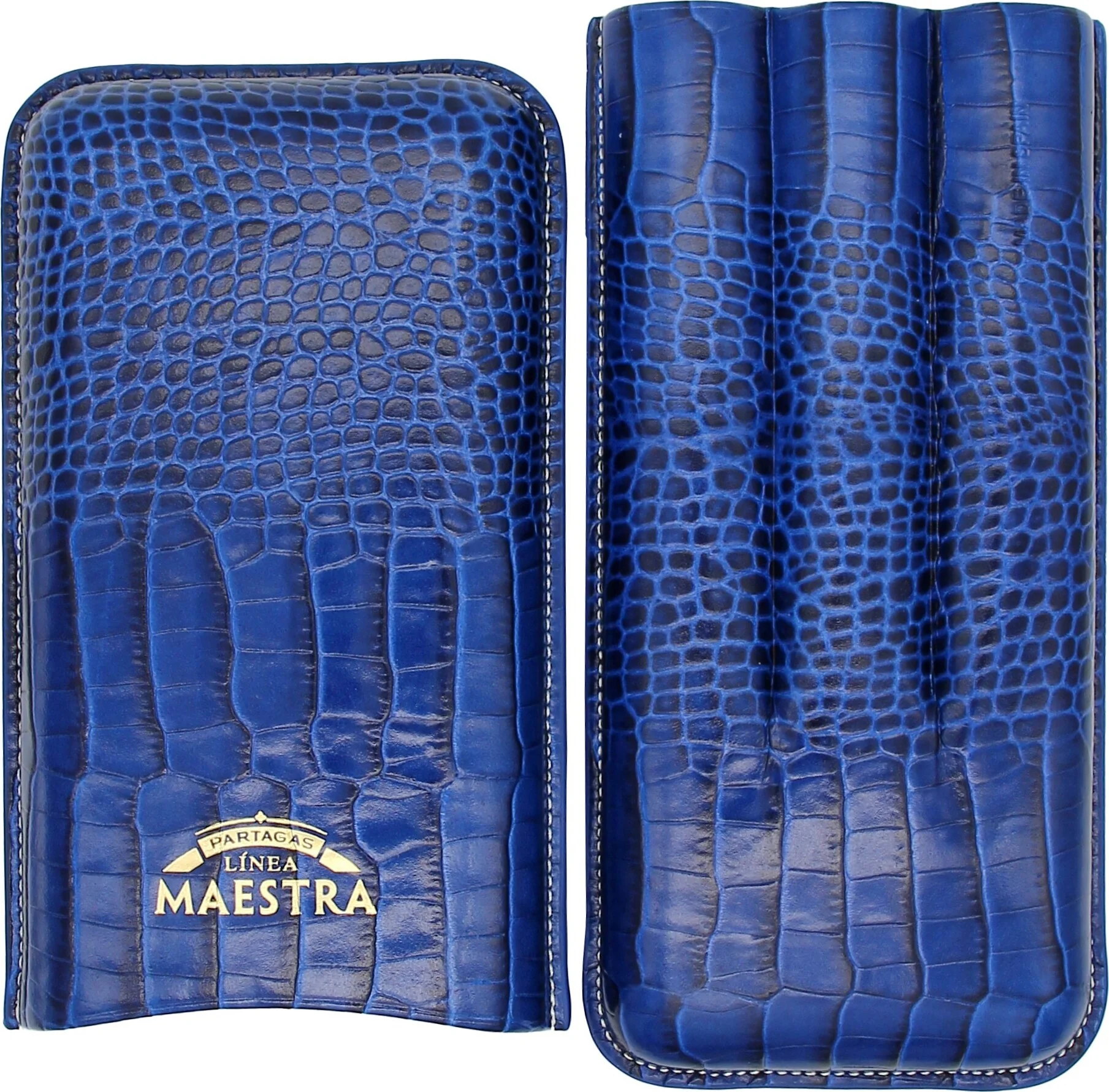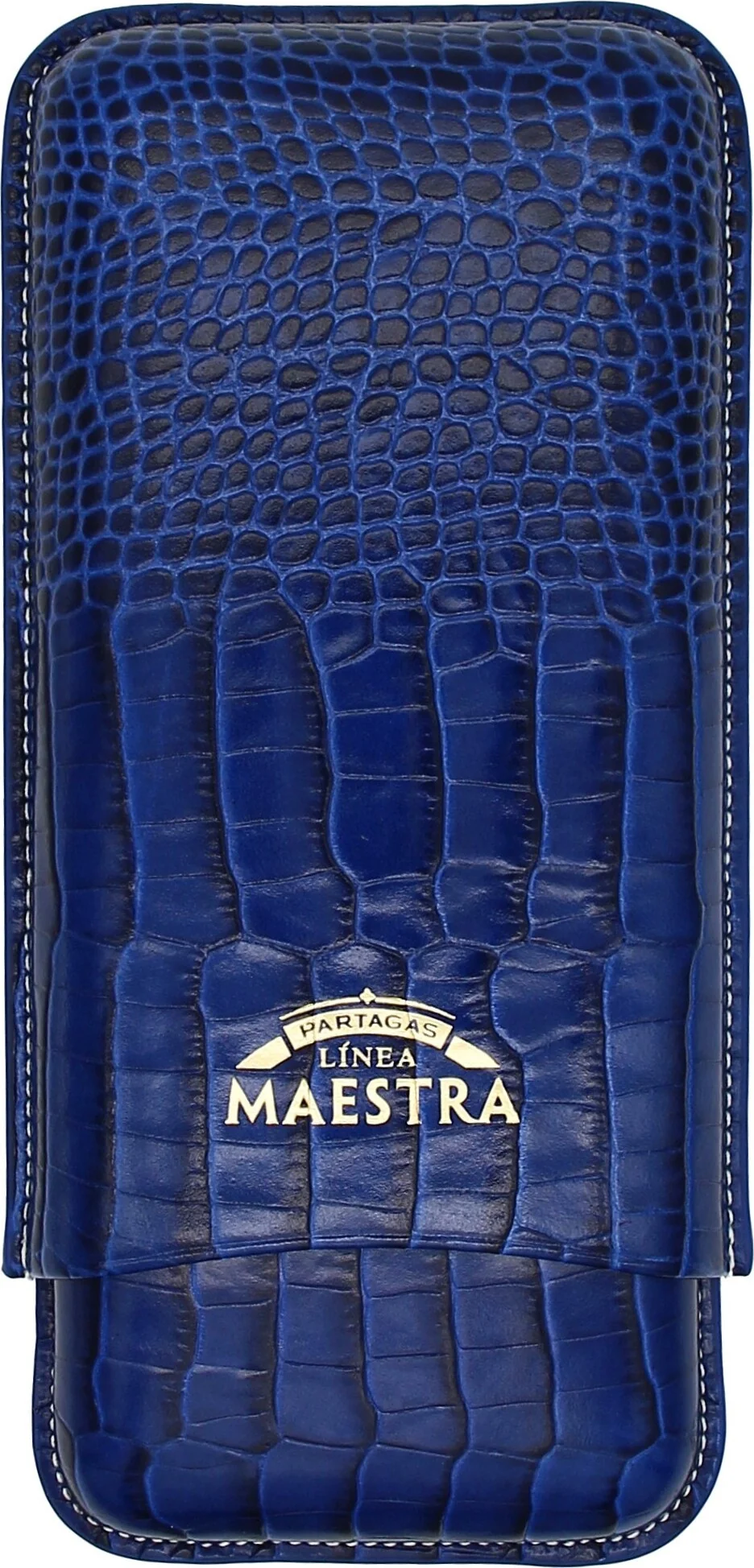 Partagas Linea Maestra -sikarikotelo, joka on aitoa nahkaa ja väriltään silmiinpistävän sininen, on kuubalaisen sikarimerkin Partagasin ylellinen lisävaruste, erityisesti heidän Linea Maestra -mallistostaan. Hienosti kohokuvioitu nahkapinta, jossa on krokotiilikuvio, antaa autenttisen ilmeen. Partagasia erehtymättömästi edustava tuotemerkin logo on näkyvästi esillä etupuolella, mikä antaa kotelolle eksklusiivisen ulkonäön.