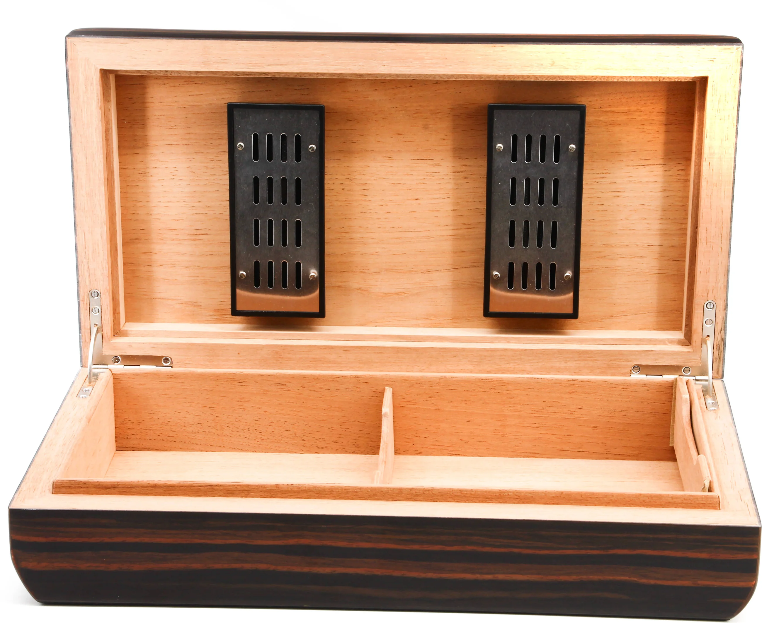 Kesaripuusta valmistetussa sisätilassa on runsaasti tilaa 80 Corona-kokoiselle sikarille, jotka voidaan järjestellä poistettavan väliseinän ansiosta. Kaksi itsesäätyvää ilmankostutinta tarjoavat kaiken tarvitsemasi kosteudenhallinnan. Lisää vain tislattua vettä ja voit olla varma siitä, että sikarisi saavat luotettavan ja tasaisen kosteuden, jolloin voit rentoutua täydellisen hyväkuntoisen savun parissa.