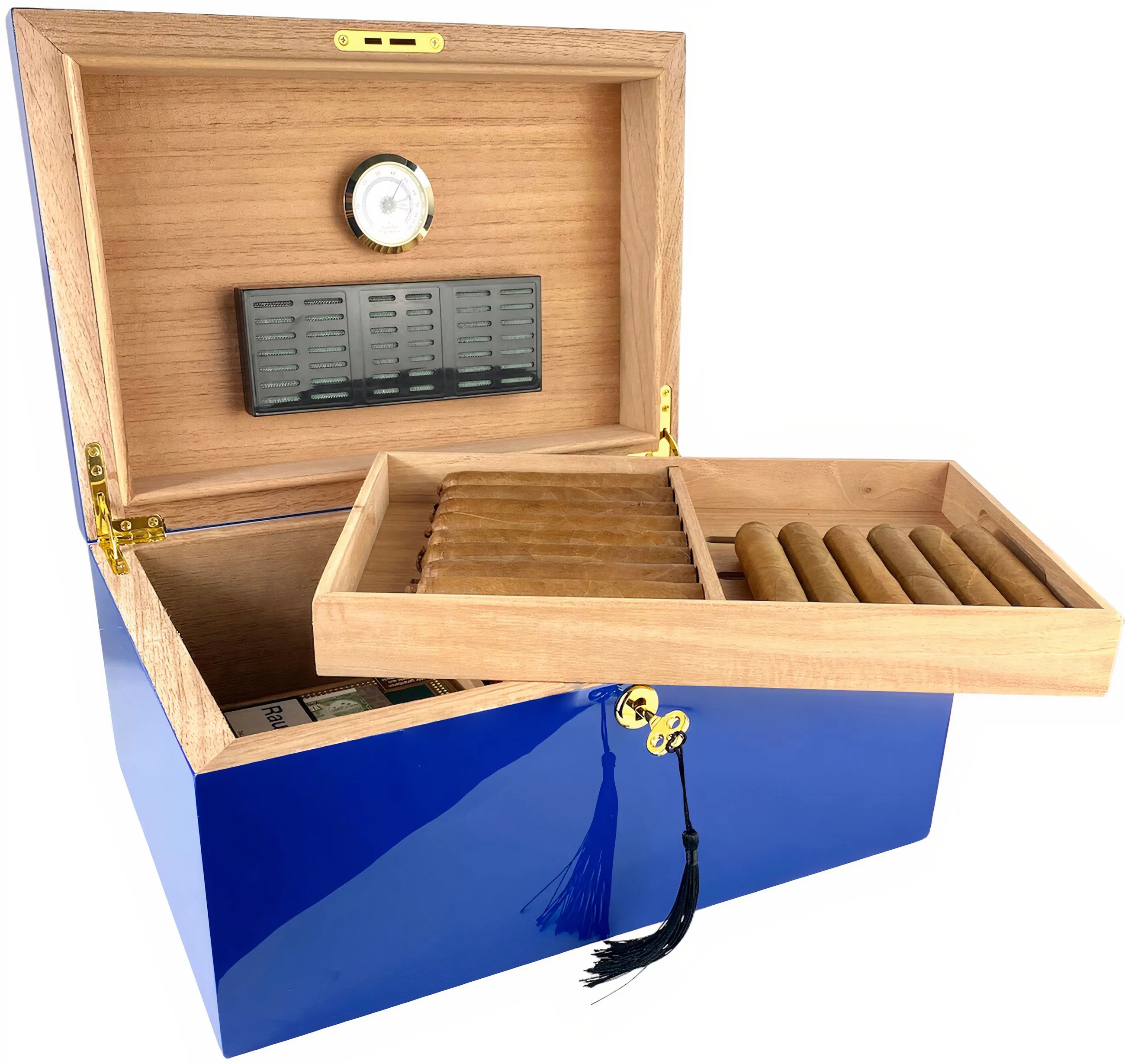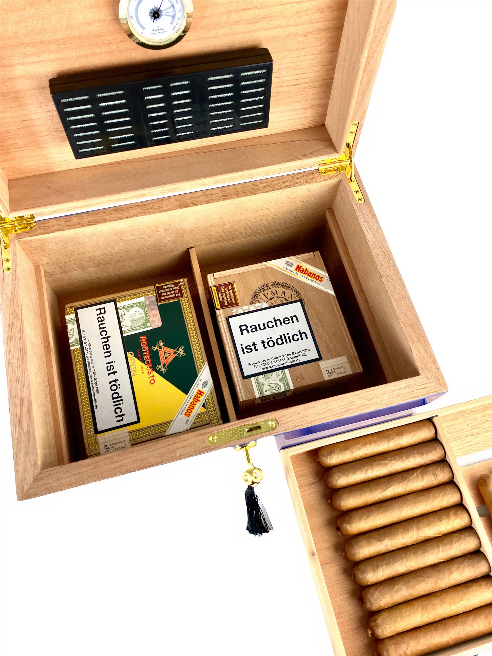 "Cigar Humidor Blue with Cuban Flag for 100 Cigars" on toiminnallisuuden ja tyylikkyyden täydellinen symbioosi, joka kiehtoo sekä kokeneita sikarin tuntijoita että keräilijöitä. Hemmottele itseäsi tällä ylellisellä humidorilla ja säilytä sikarisi tyylikkäässä säiliössä, joka vangitsee kuubalaisen sikarimaailman olemuksen. Jokaisen sikariharrastajan pakollinen hankinta ja lahja, joka tullaan muistamaan.