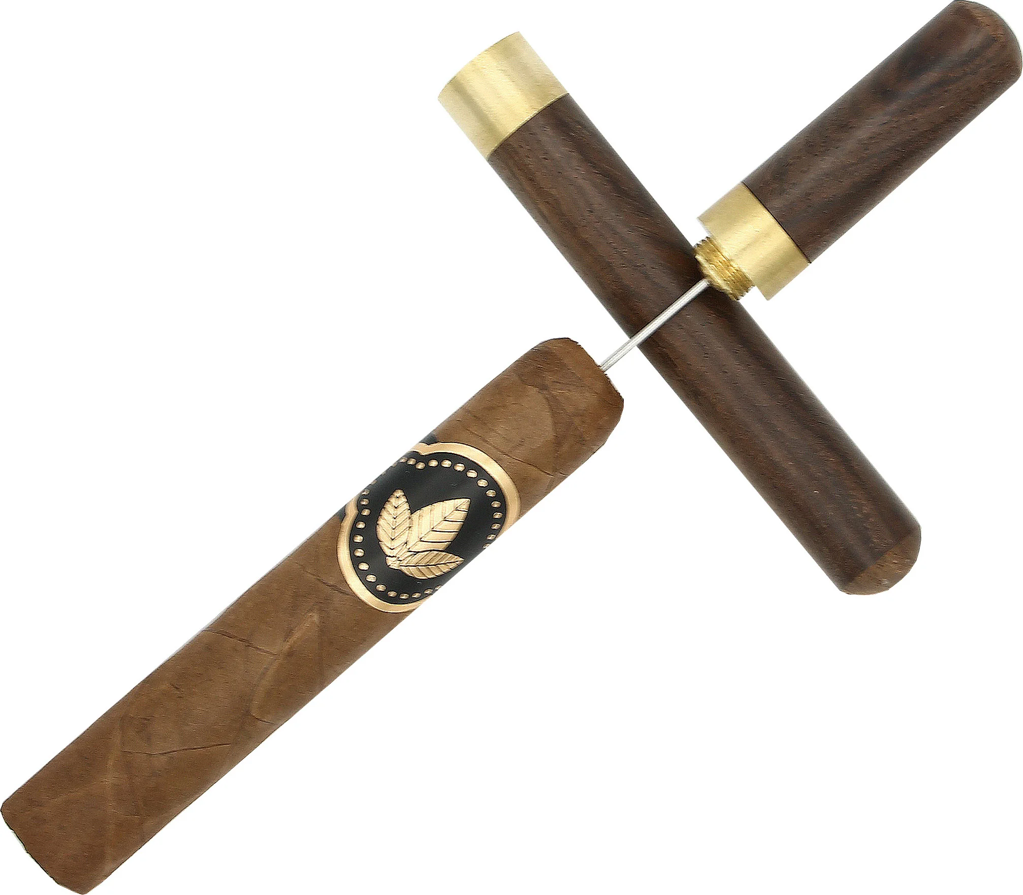 Jalo sikarityökalu eebenpuusta vankalla ruostumattomasta teräksestä valmistetulla kierteellä. Tämän työkalun avulla sinulla aficionadana/aficionadona ei ole mitään menetettävää. Kaksi ruuvikierrettä paljastavat kaksi erilaista työkalua sikarin nauttimiseen. Toista käytetään parantamaan vetoa sikarissa, joka on ehkä kääritty hieman liian tiukasti ja tiiviisti. Tämä 9 cm:n pituinen apuväline pienillä integroiduilla väkäsillä pelastaa kaikenkokoisia sikareita.