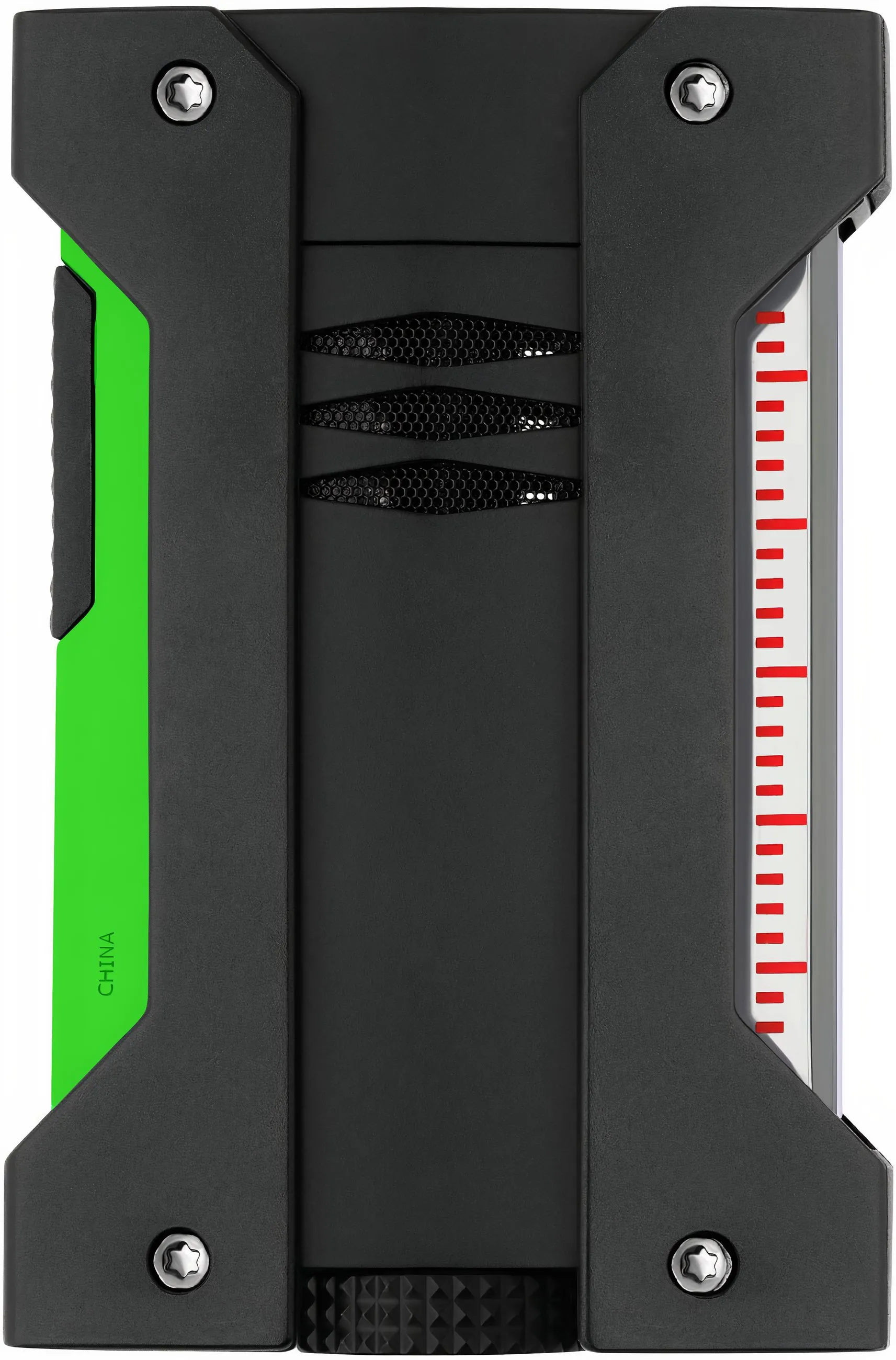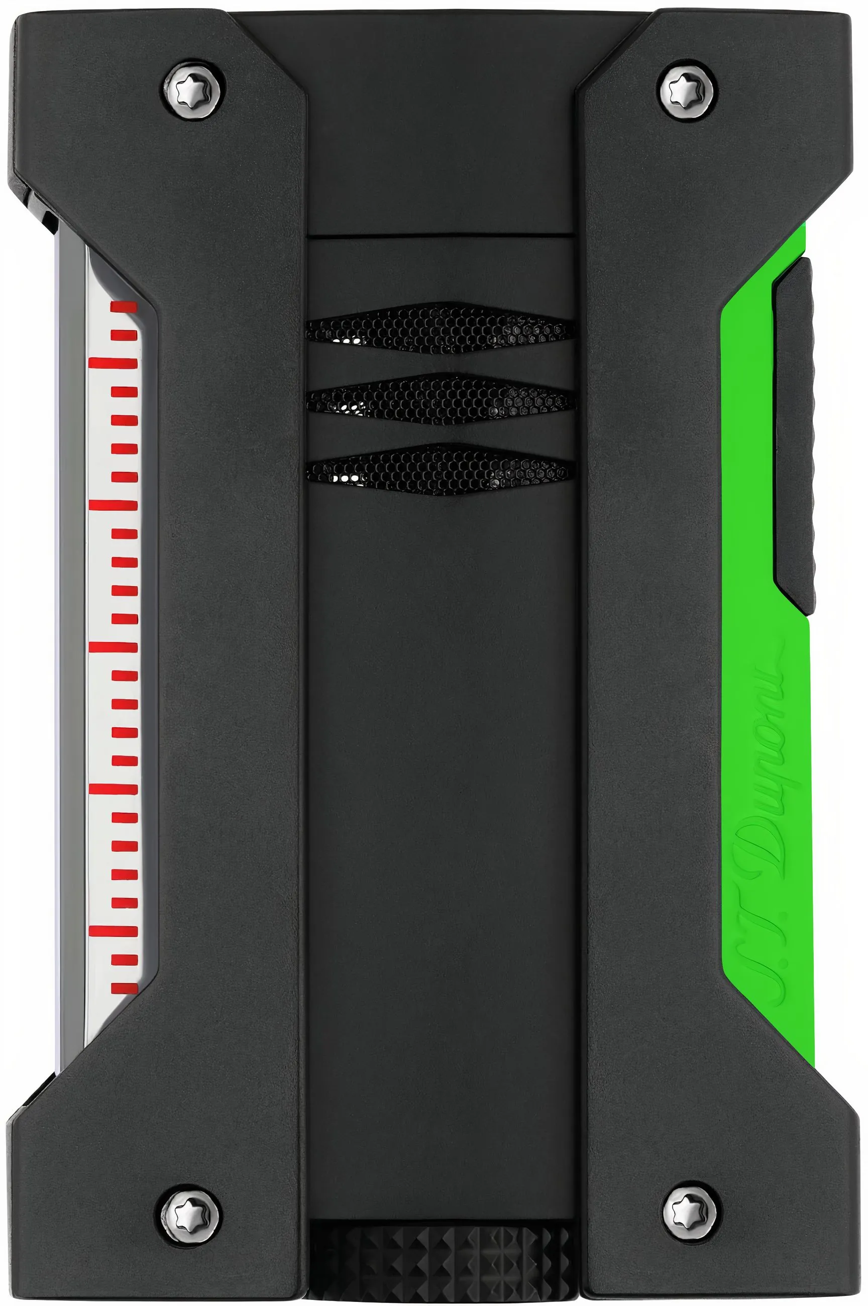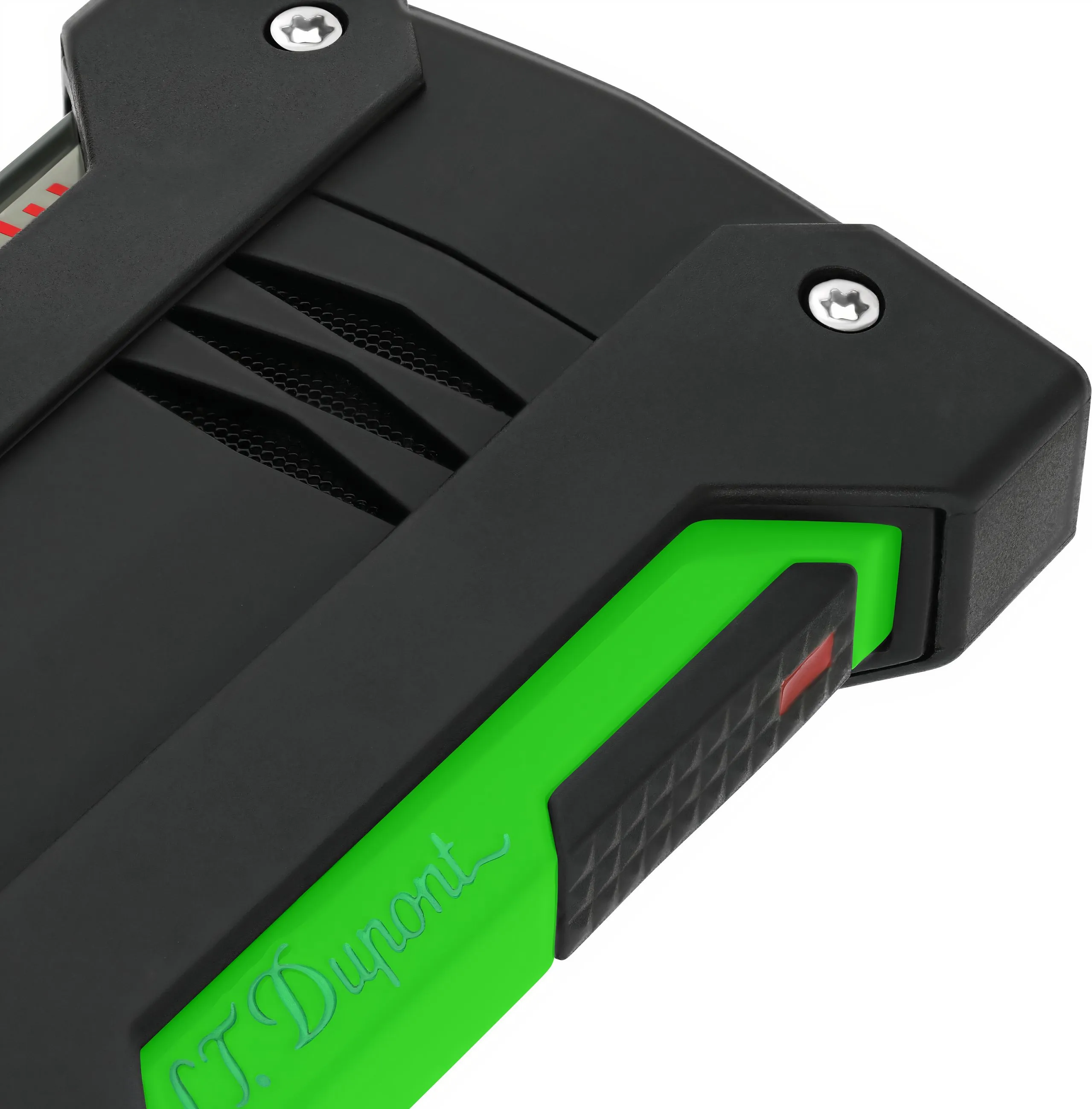 Ruiskupuristetusta metallista valmistettu mattamusta runko täydentyy tyylikkäästi kirkkaanvihreällä korostuksella. Vihreällä korostettu painonappi luo kauniin ja modernin kontrastin sytyttimen mattapintaiseen runkoon. Suuri ja näkyvä kaasutason ilmaisin on erityisen käytännöllinen kaasun määrän seuraamiseen. Toinen kohokohta on sytyttimen pohjassa olevan liekin voimakkuuden säädön mukava käyttö. Tähän on asennettu helppokäyttöinen pyörä, kun taas muiden sytyttimien säätämiseen tarvitaan yleensä lisätyökaluja, kuten ruuvimeisseliä. Kirkkaanpunainen suojakorkki estää sytytintä pölyyntymästä tai likaantumasta, mikä tekee sytyttimestä omistajalleen pitkäaikaisen ilon. Tämä suojakorkki avautuu automaattisesti, kun painiketta painetaan, ja sulkeutuu myös automaattisesti. Painonappia koristaa Dupontin tunnusmerkki, joka on erehtymätön laatutarvike.