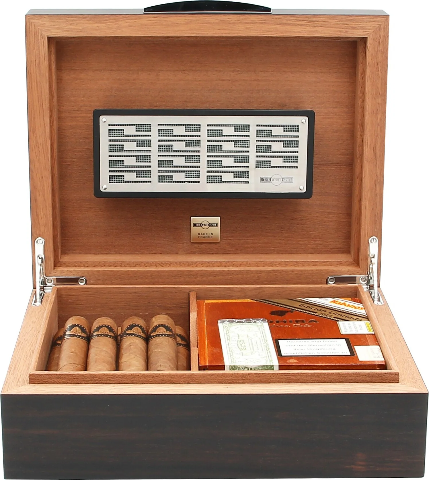 Sen kapasiteetti on noin 50 sikaria, joten se tarjoaa runsaasti tilaa kokoelmallesi tai jopa pienemmille sikarilaatikoille. Kiiltävästä kromista valmistettu tyylikäs kahva, johon on kaiverrettu White Spot -logo ja kuuluisa valkoinen piste, korostaa esteettisesti harmonista yleisilmettä ja eksklusiivista brändi-identiteettiä. Jo ensisilmäyksellä on selvää, että kyseessä on laadukas merkkituote.