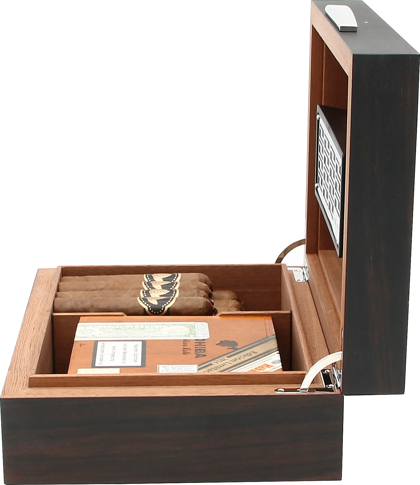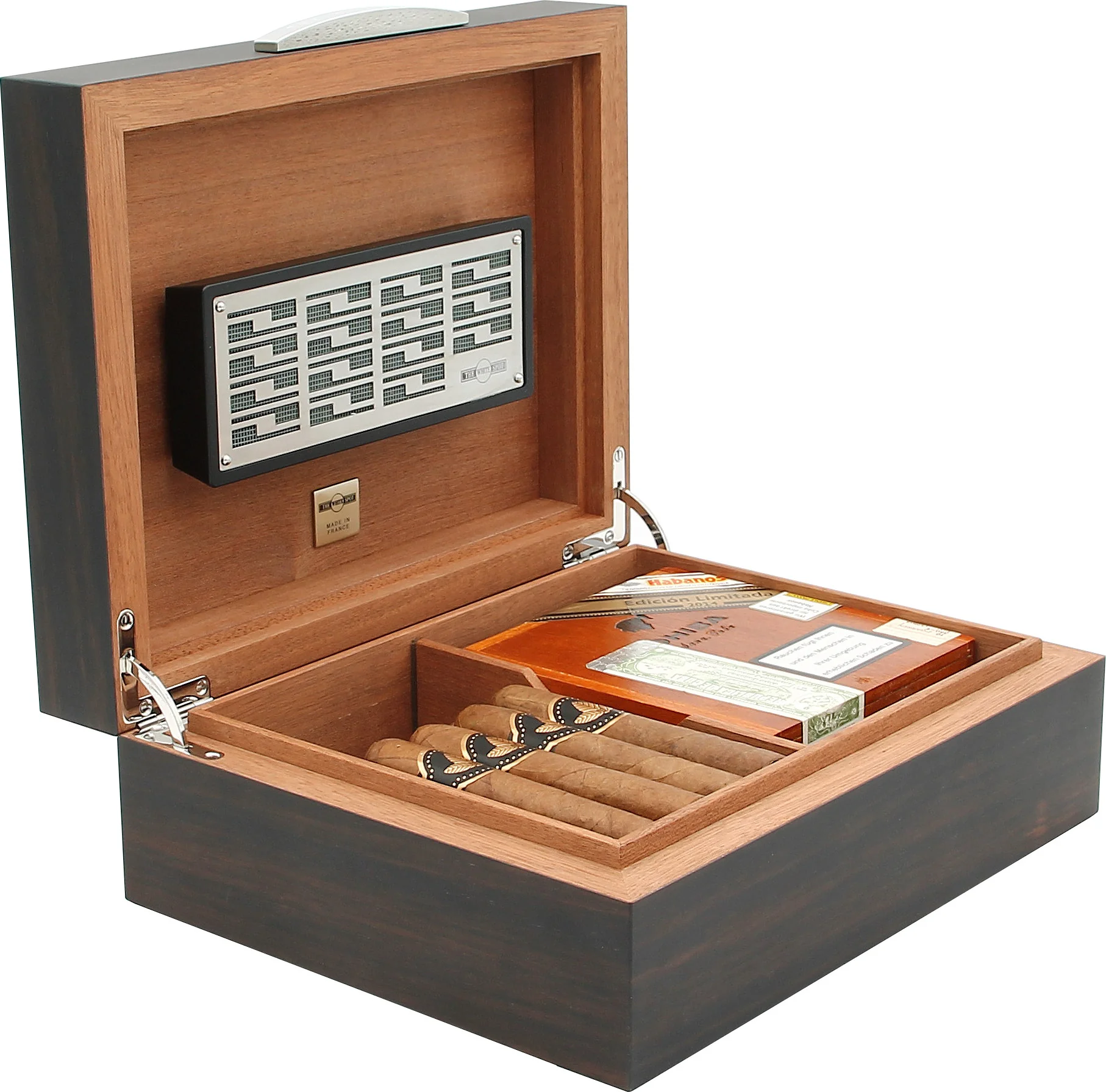 Humidori on valmistettu Dunhillille Ranskassa, kuten sisällä oleva laatta vaikuttavasti vahvistaa.