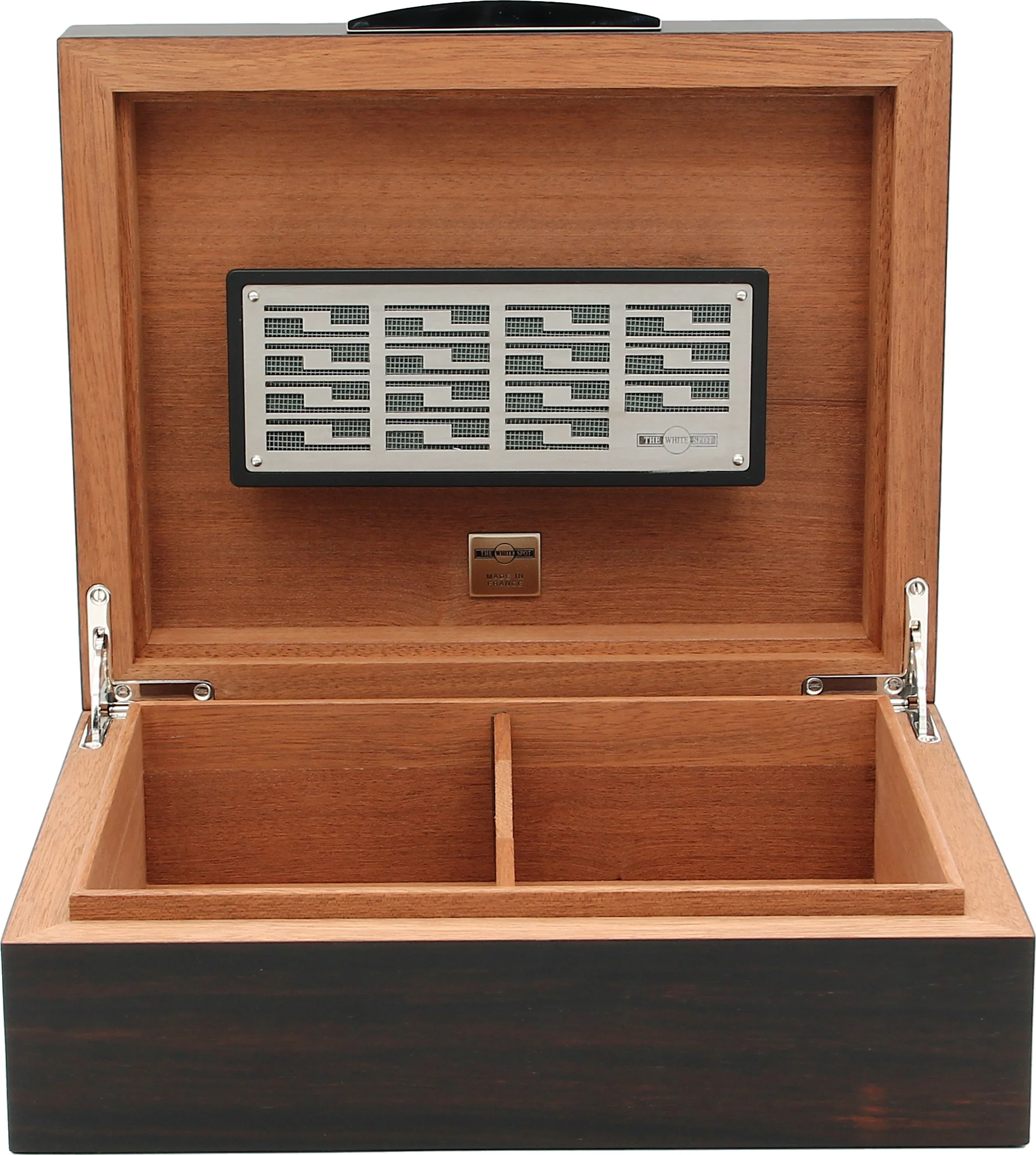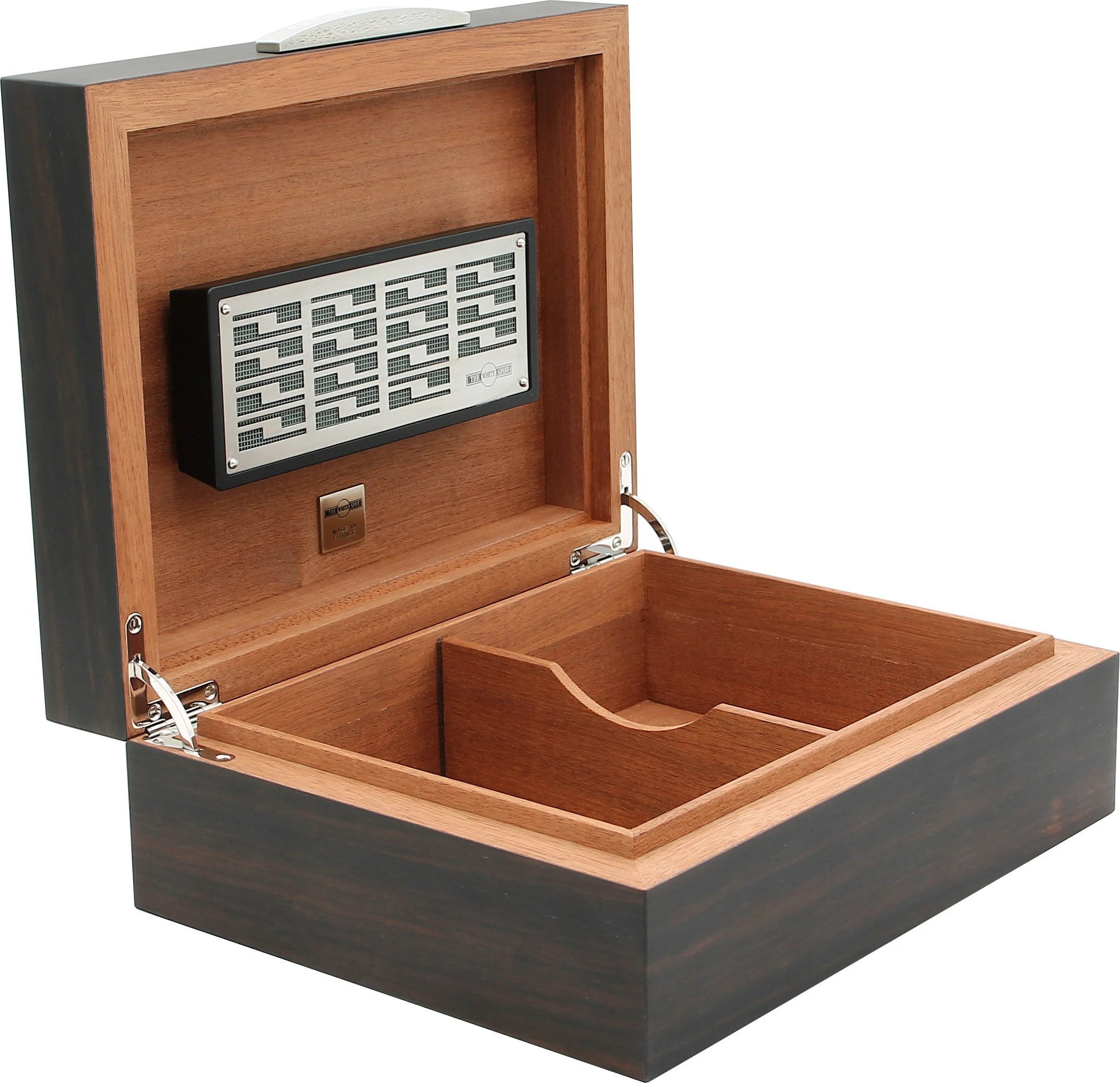 White Spot by Dunhill Humidori on perinteisen englantilaisen Dunhill-brändin hieno humidori, joka on valmistettu korkealaatuisesta Makassar-puuviilusta, jonka väri on tyylikäs tummanruskea ja jossa on hienojakoinen puu. Tämä humidori ilmentää klassista eleganssia ja korkeinta käsityötaitoa, helmi vaativille sikarien ystäville.